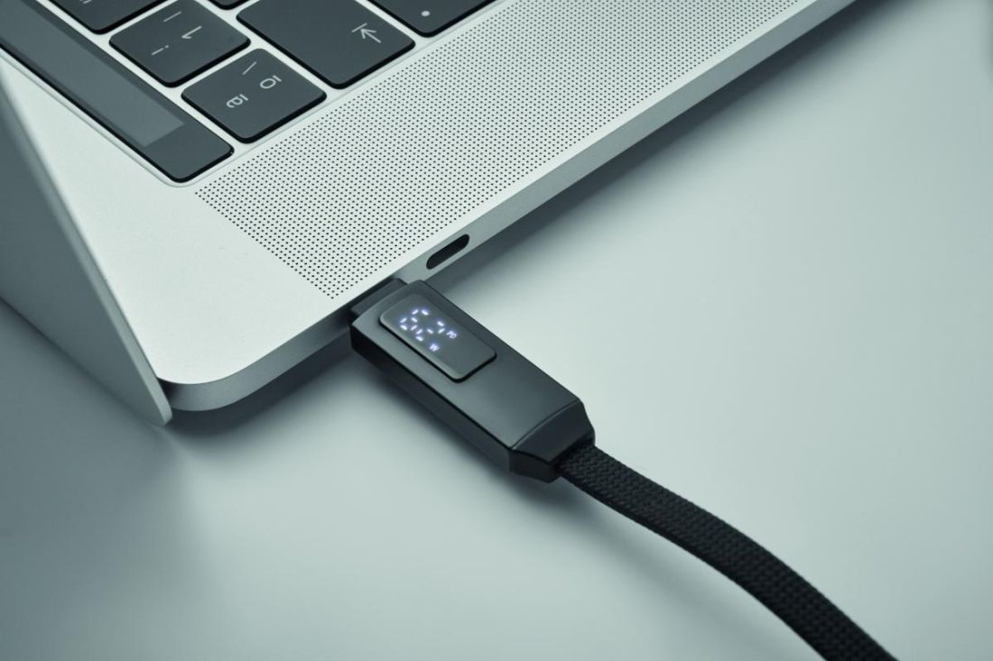 Cable de carga y datos de 60 W con llavero. Tipo-C a tipo-C con pantalla LED con función de visualización de la potencia de carga. Cierre magnético.