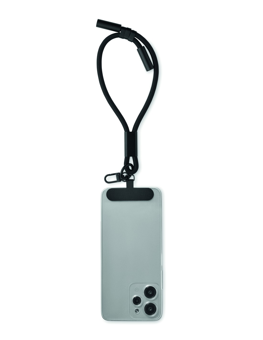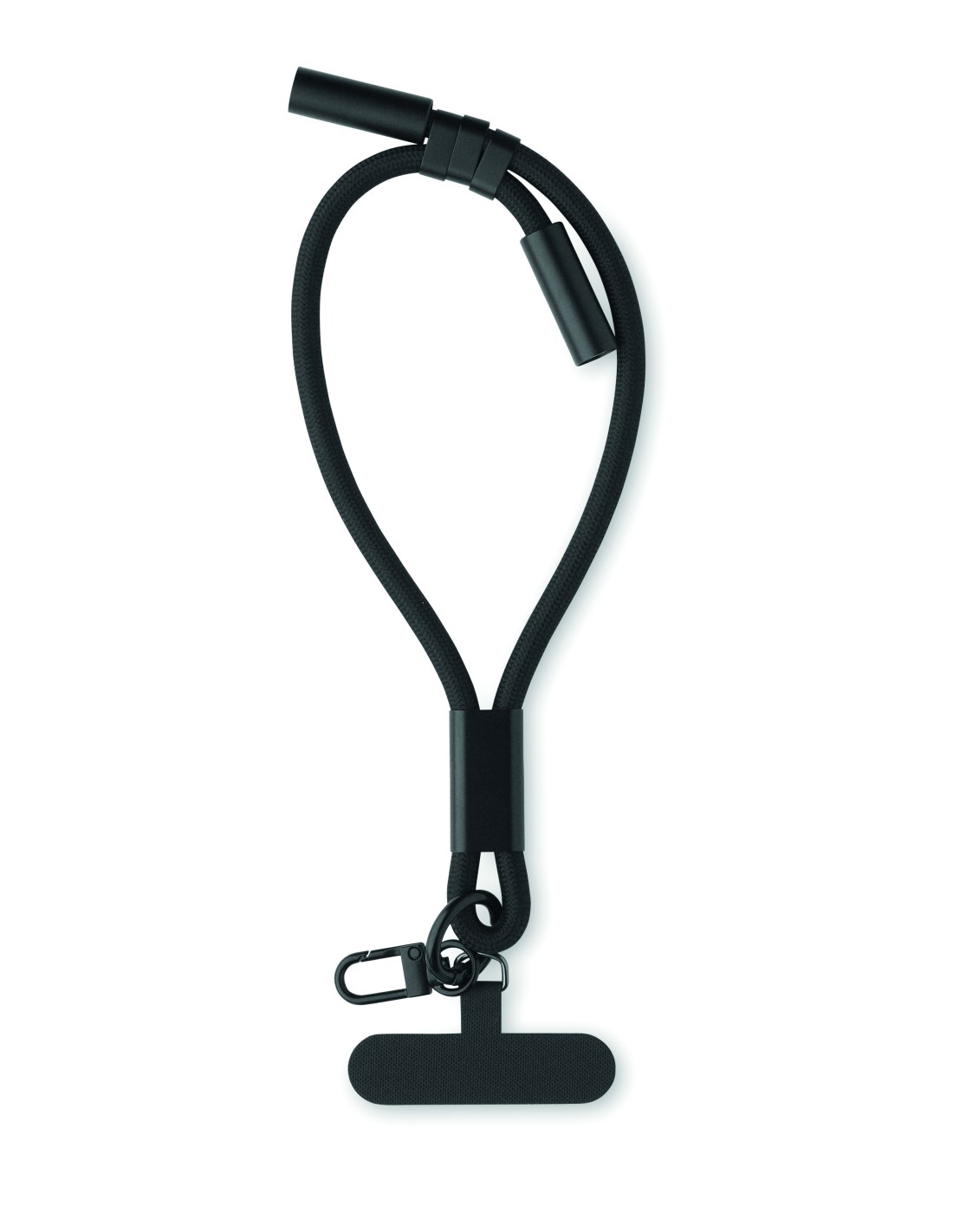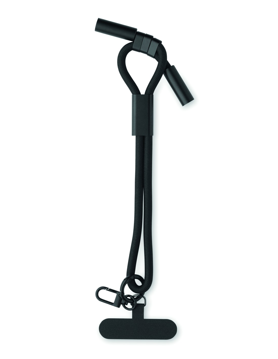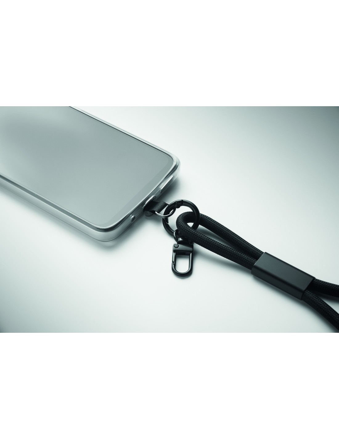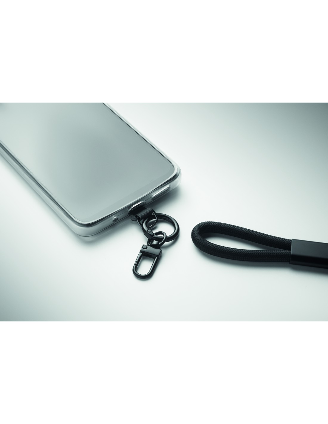 Pulsera cable de carga y datos de 60 W de tipo C a tipo C en RPET con soporte para cable de teléfono y clip para llaves.