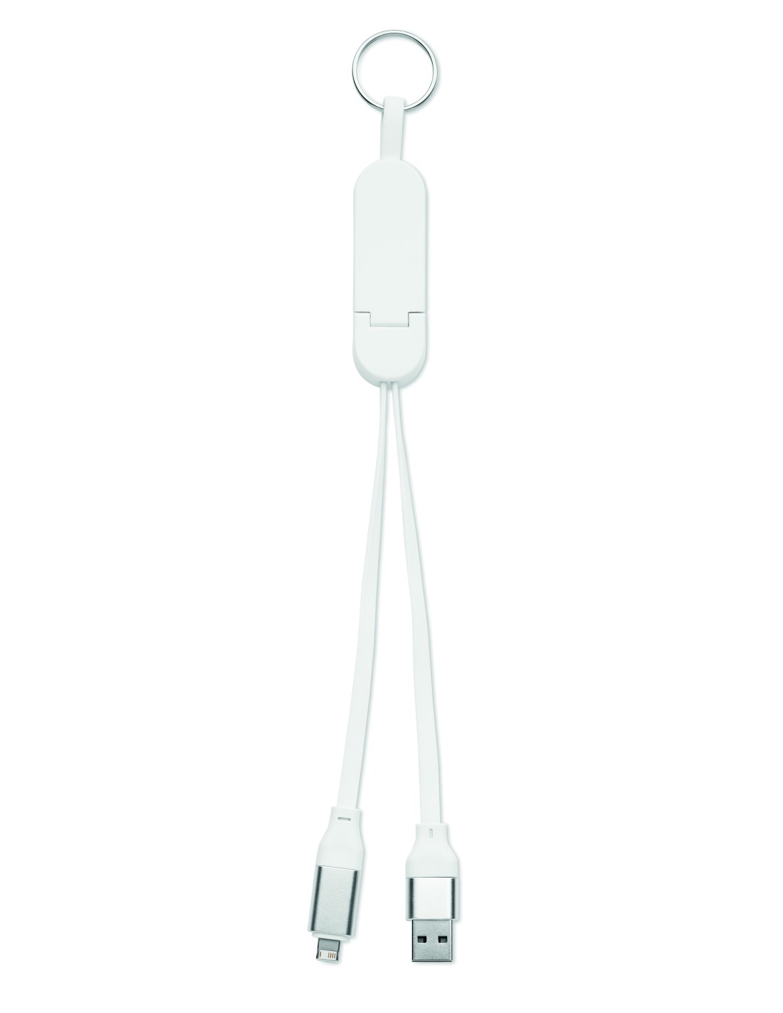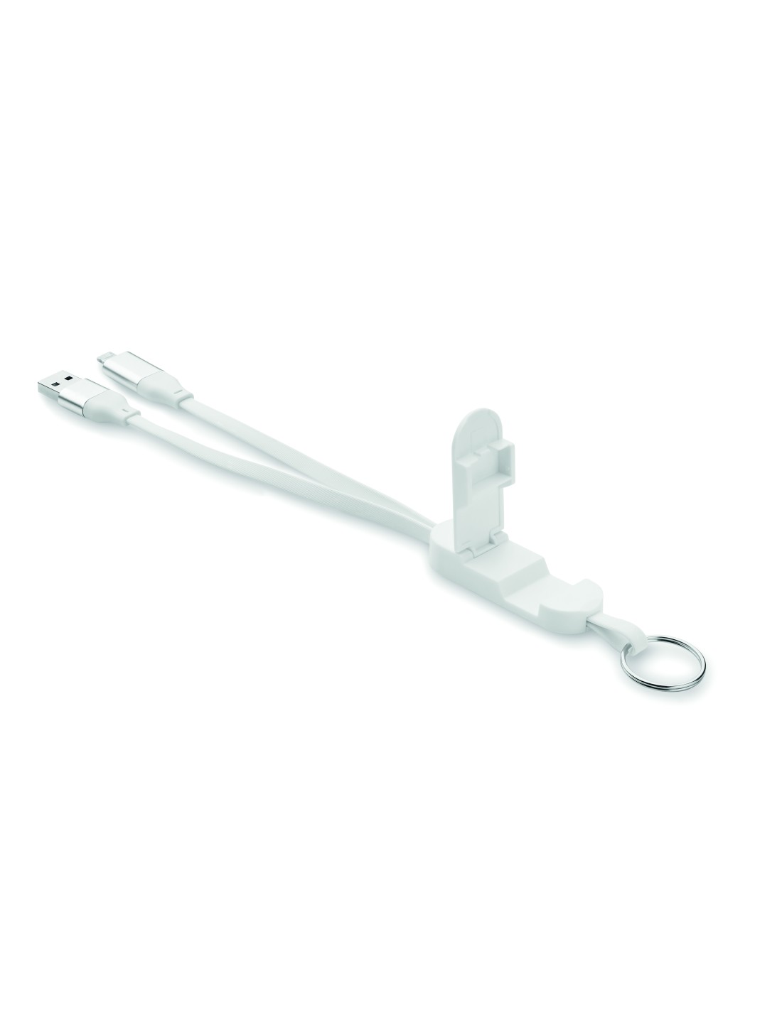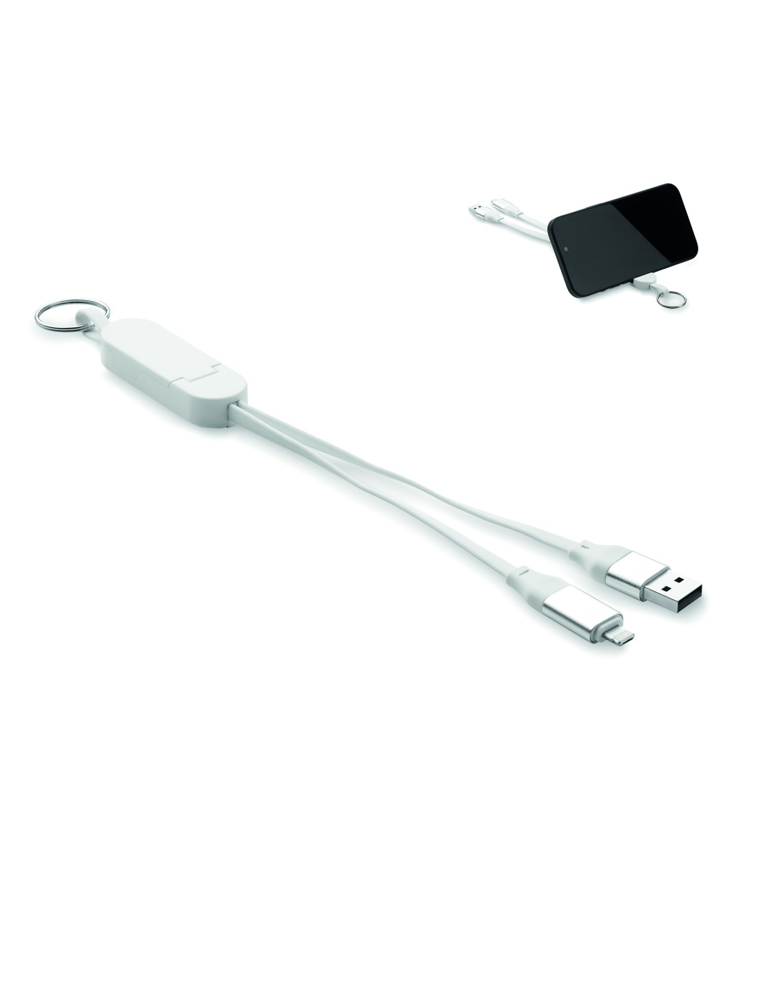 Llavero y soporte para teléfono con cable de 60 W en carcasa de ABS reciclado. Entrada: 2 en 1 Tipo-C y Tipo-A. Salida: Tipo-C y micro-B (2 en 1 clavija). Longitud del cable: 26 cm.