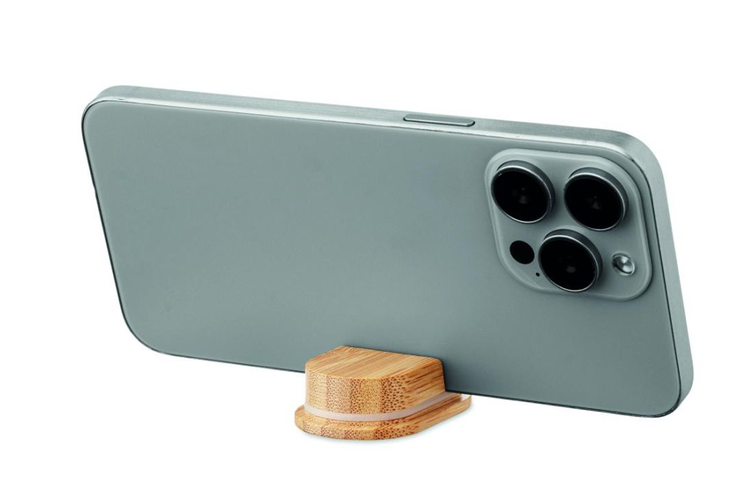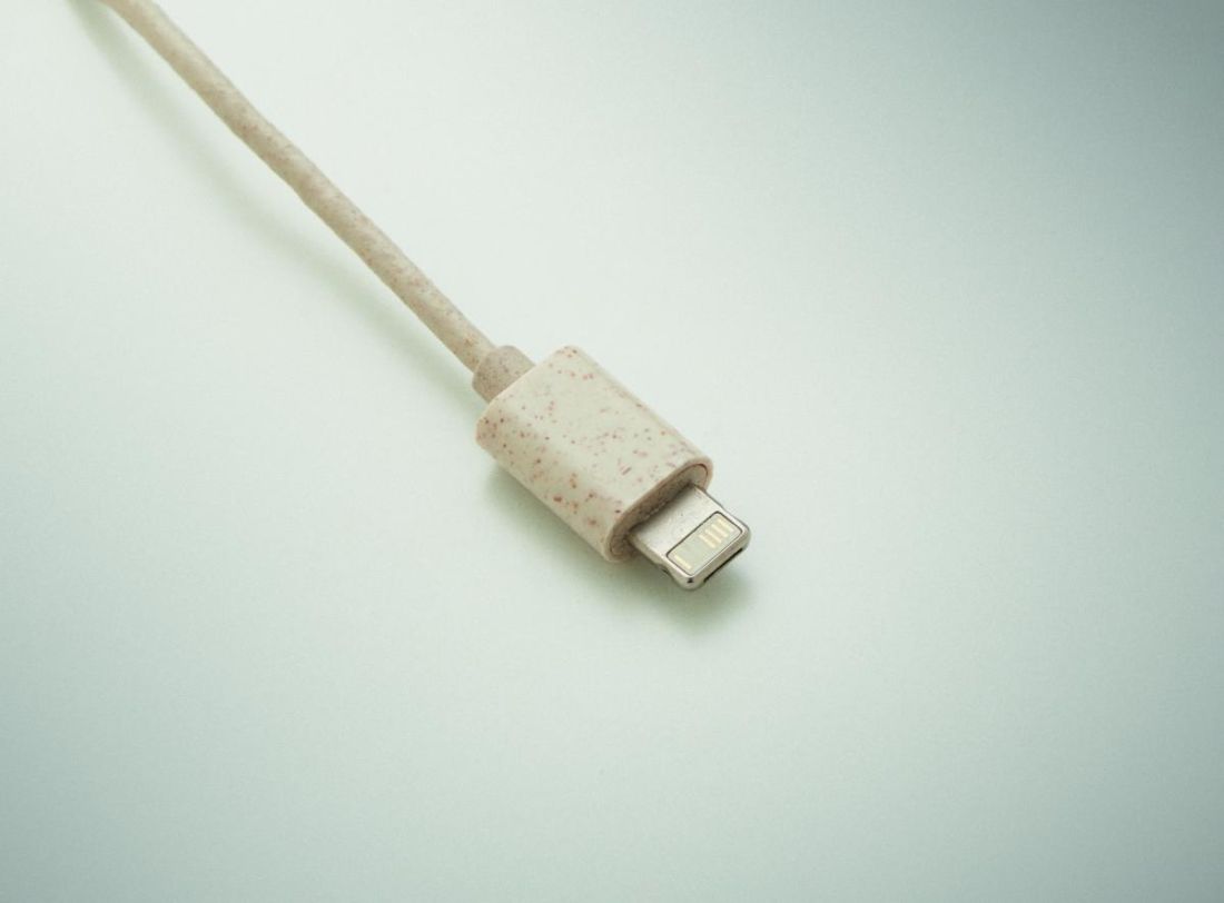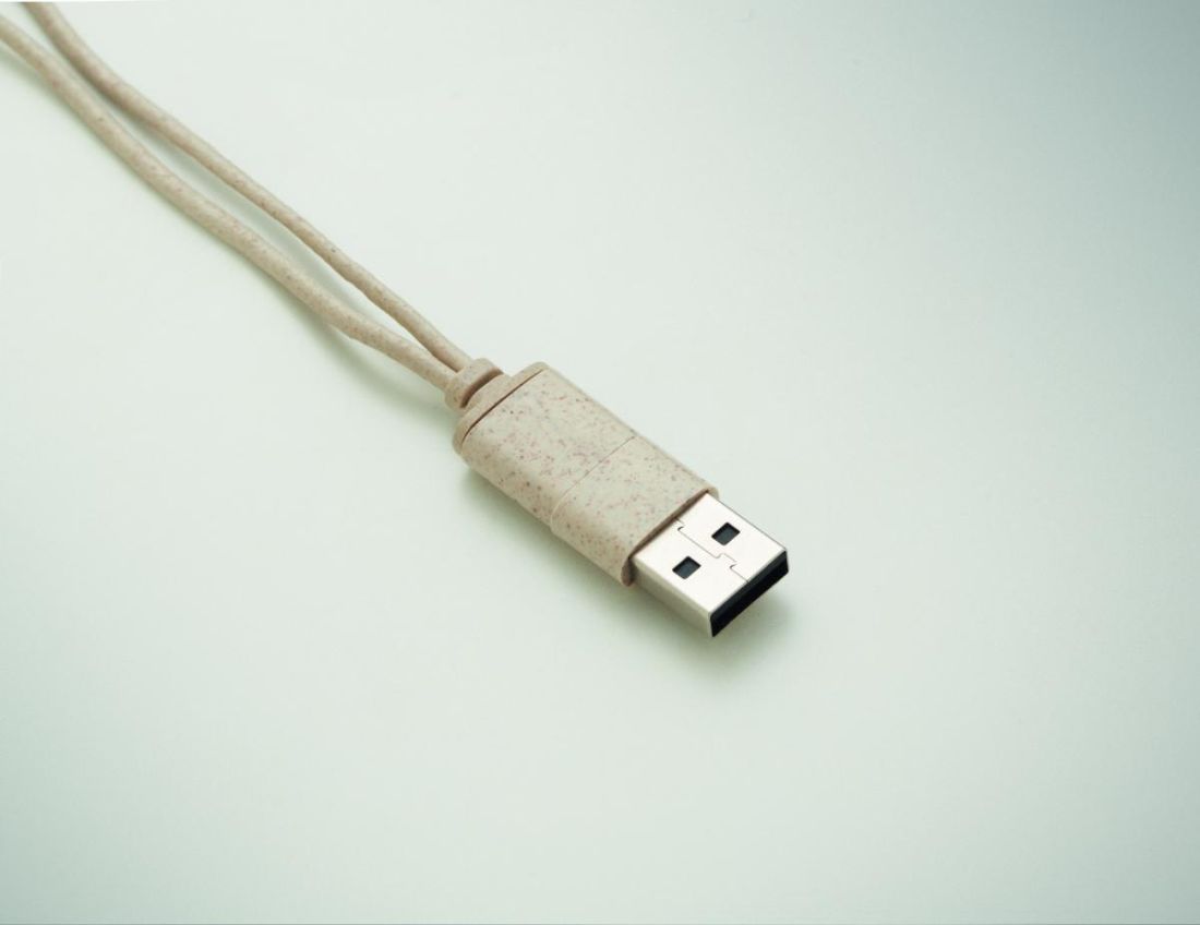 Set de cables en estuche de paja de trigo/ABS con tapa de bambú y mosquetón. La tapa sirve de soporte para el móvil (en posición horizontal). Entra…