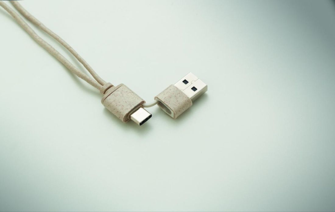 Set de cables en estuche de paja de trigo/ABS con tapa de bambú y mosquetón. La tapa sirve de soporte para el móvil (en posición horizontal). Entrada de cable 2en1 USB-C/A, salida Type-C y 2 en 1 pin.