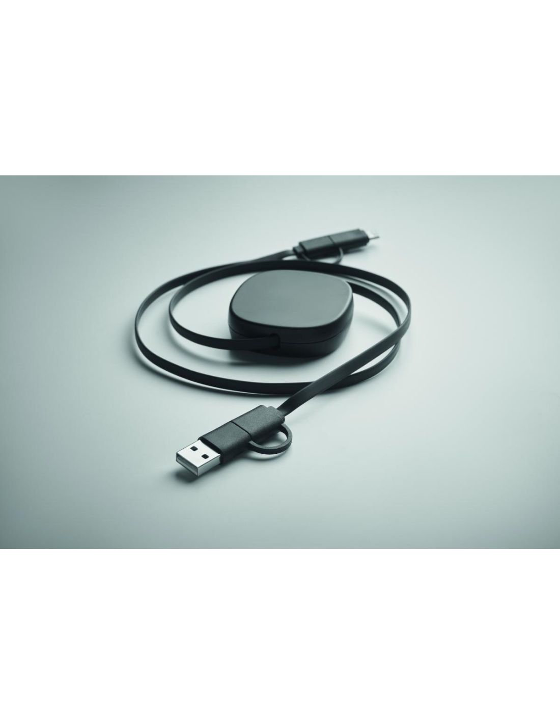 Cable de carga retráctil de 60W. Carcasa de ABS reciclado. Entrada: 2 en 1 Tipo-C y Tipo-A. Salida: Tipo-C y micro-B (2 en 1 clavija). Longitud del cable: 80 cm.