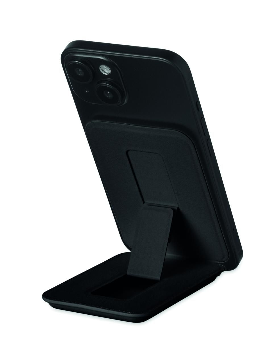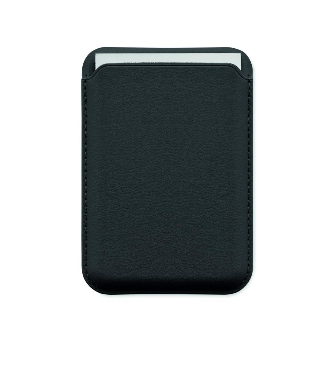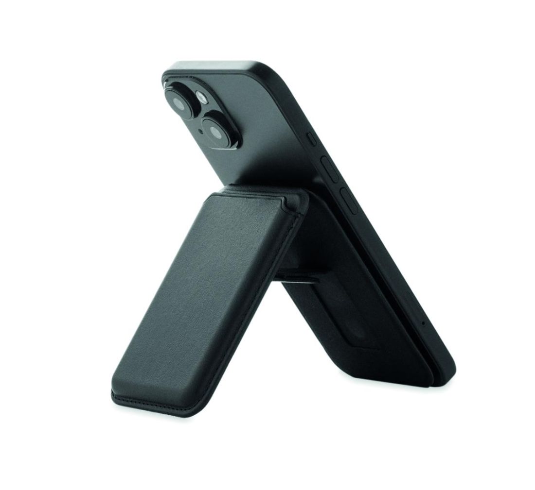 Tarjetero magnético de polipiel de PU para tarjetas de crédito (para 3 tarjetas) con función de soporte. Incluye una anilla metálica adicional.