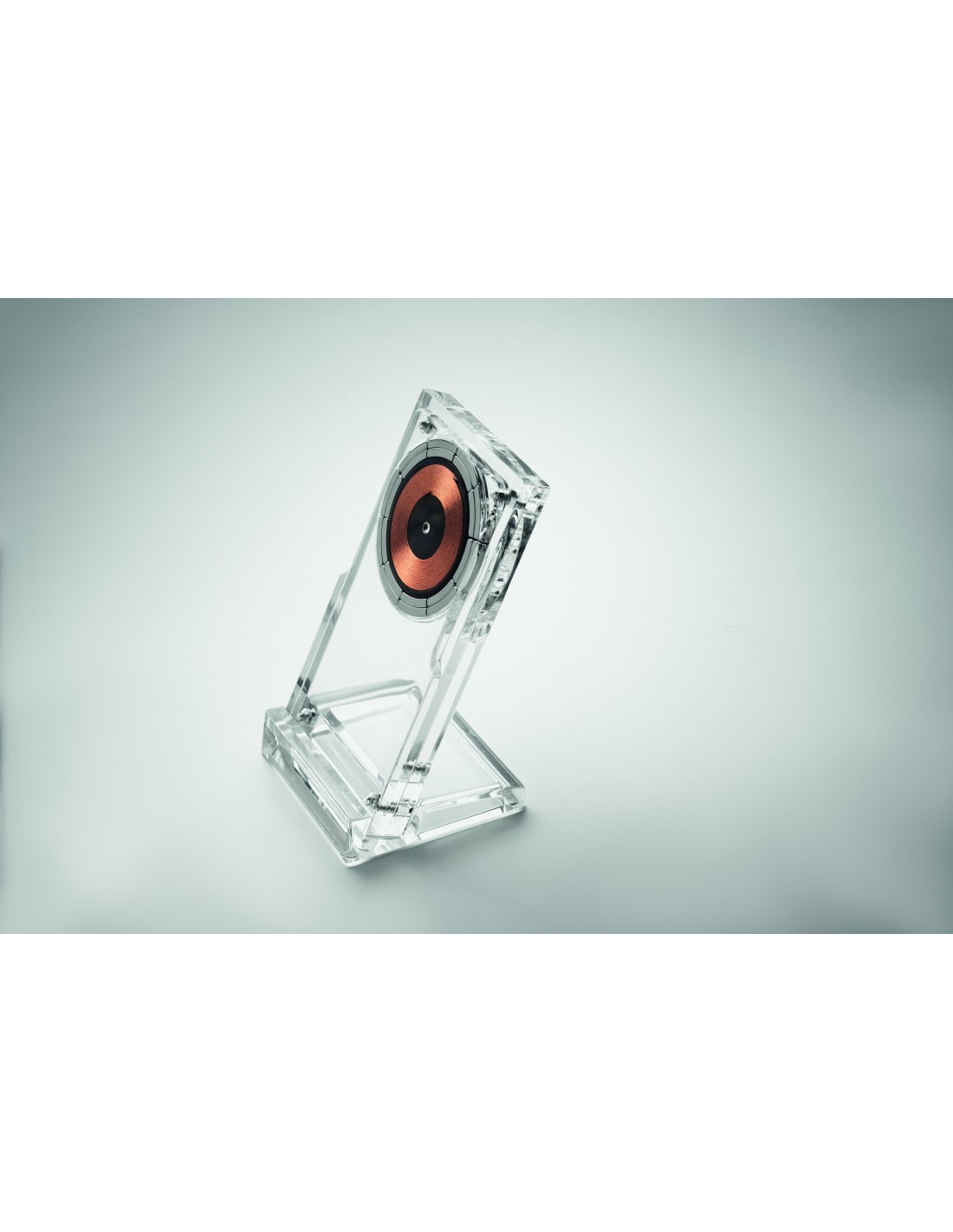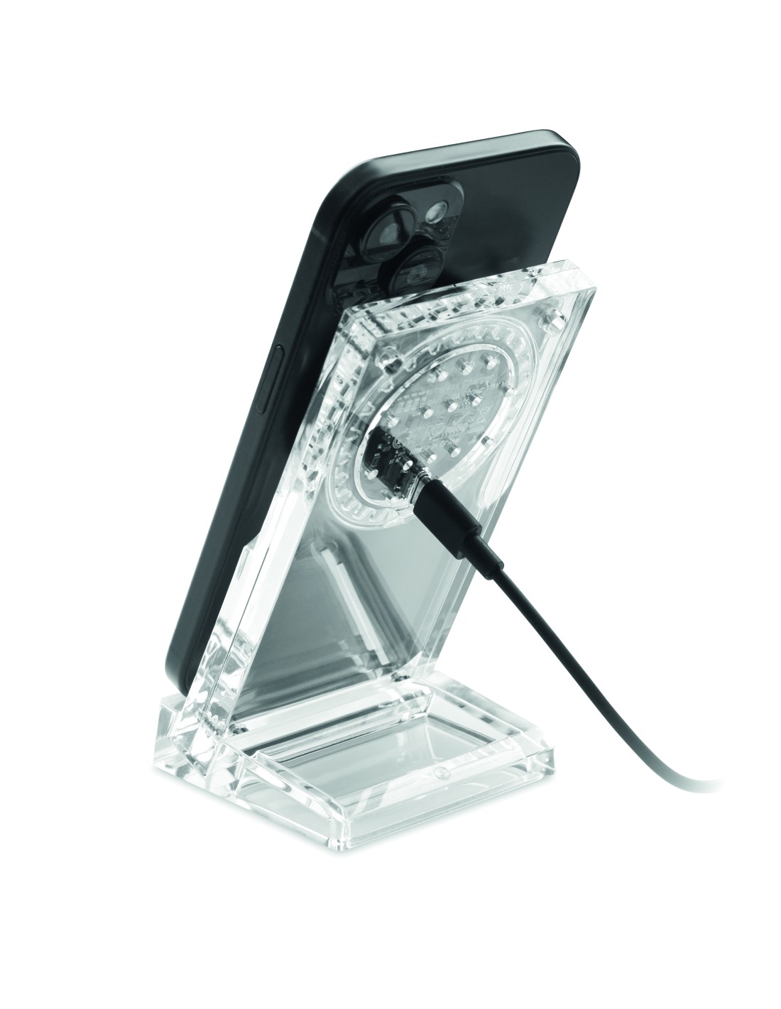 Cargador inalámbrico (15 W) en acrílico con soporte para teléfono. Al conectarlo a una fuente de alimentación, cargará tu dispositivo móvil de forma inalámbrica. Salida: 9V/1,67A (15W) para una carga rápida.