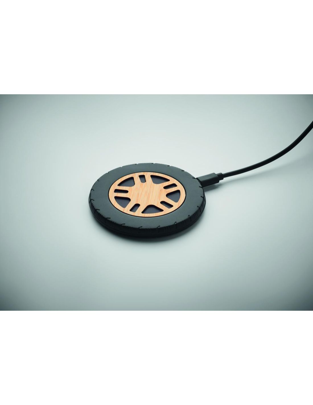 Cargador inalámbrico de 15 W en ABS reciclado y tapa de bambú. Diseño de neumático de coche. Conecta el dispositivo al ordenador, coloca el smartphone encima y deja que se cargue. Salida: DC 9V/1.10A (15W) para carga rápida. Compatible con todos los dispositivos habilitados para QI como los últimos Androids, iPhone® 8, X y más recientes.