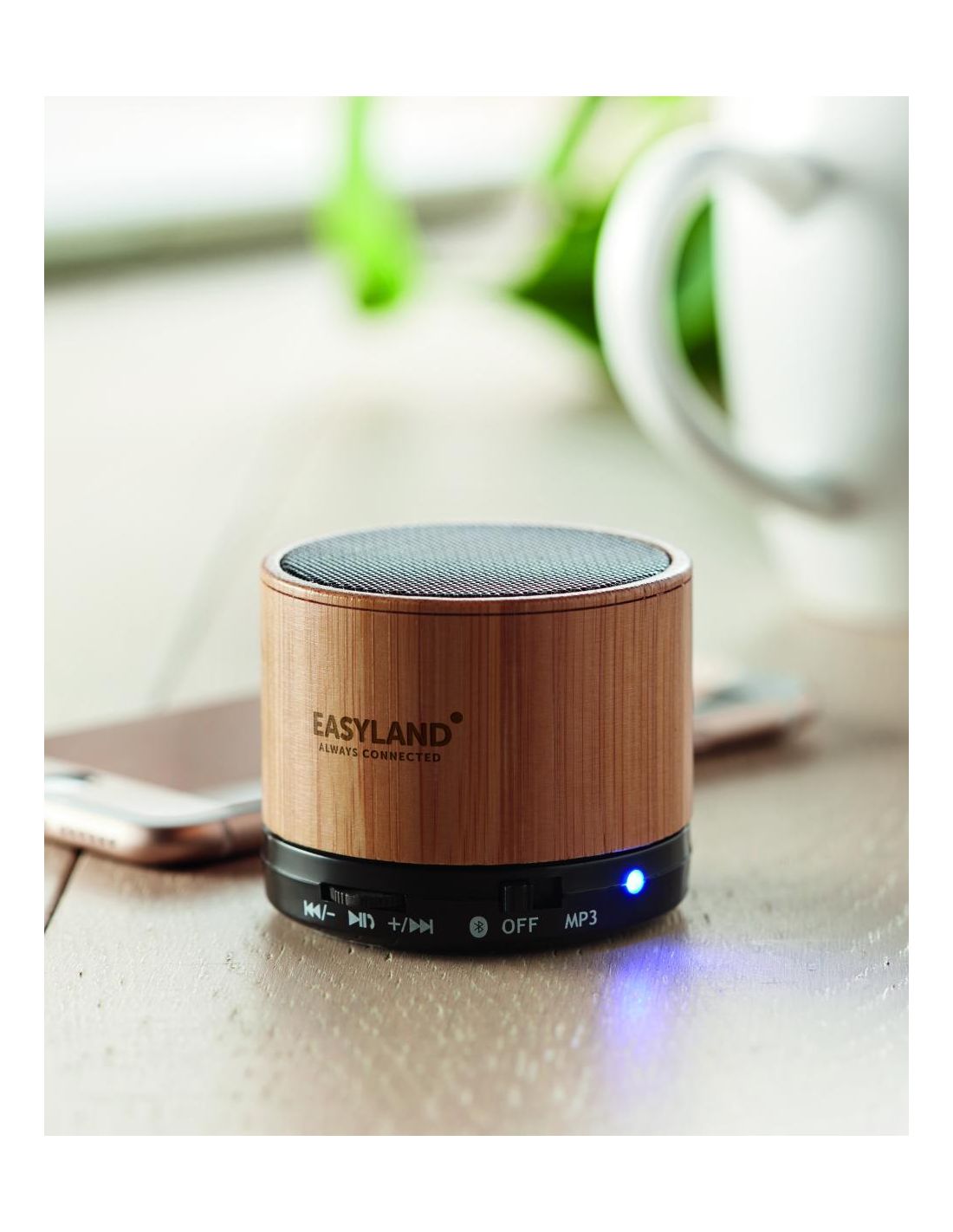 Altavoz inalámbrico 4.2 en ABS con carcasa de bambú y luz indicadora LED. Batería de litio recargable de 450 mAh. Incluye puerto para tarjeta SD y cable AUX / USB. Función de manos libres. Datos de salida: 3W, 3 Ohm y 5V. Tiempo de reproducción aprox. 3h. El bambú es un producto natural, puede haber ligeras variaciones en el color y el tamaño por artículo, lo que puede afectar el resultado final de