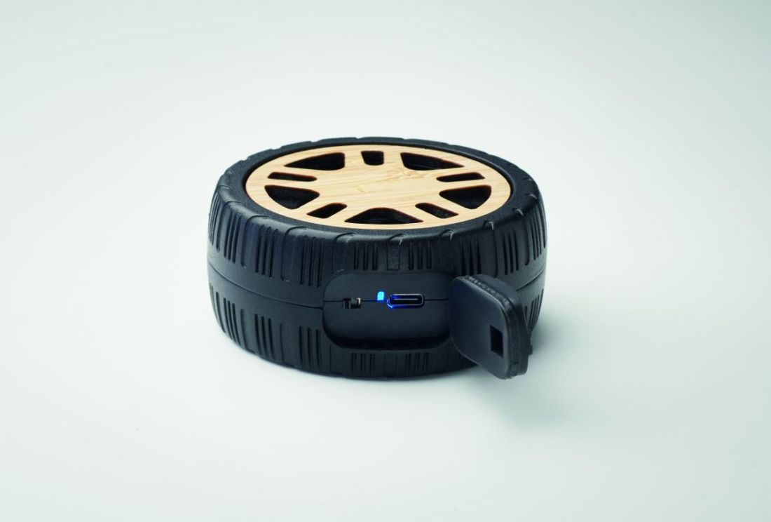 Altavoz inalámbrico 5.3 de 3W con forma de neumático de coche en ABS reciclado con detalle de bambú y asa de algodón. Batería recargable de 400 mAh.