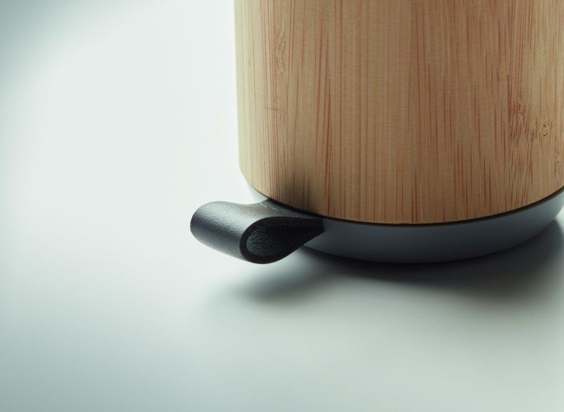 Altavoz inalámbrico 5.3 con carcasa de bambú y ABS en la parte superior con asa de PU. 1 batería recargable de Li-Ion de 300 mAh. Datos de salida: 3W, 4 Ohm. Tiempo de reproducción aprox. 2h. El bambú es material natural, el color del articulo puede variar.