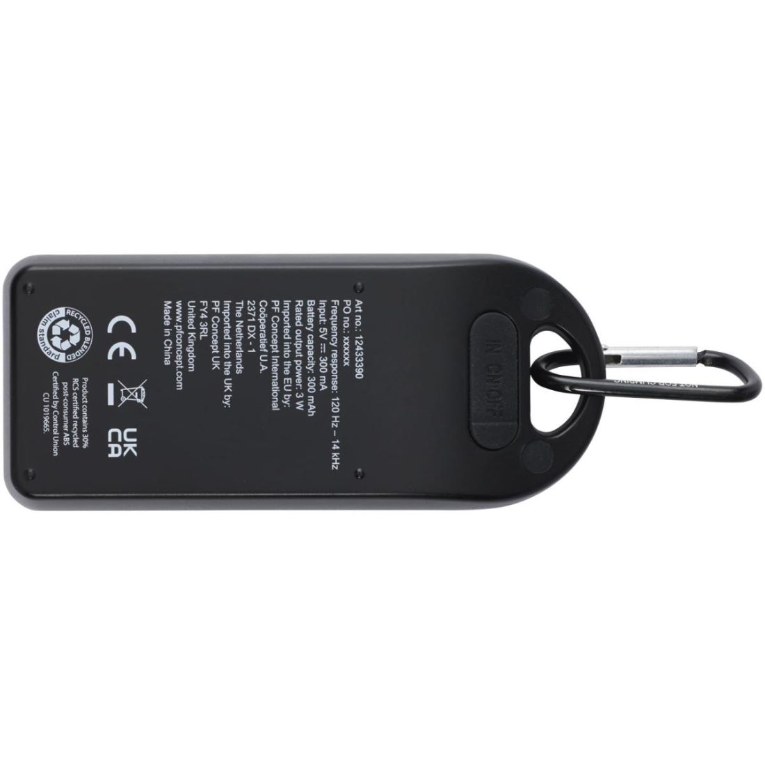 Altavoz Bluetooth® de plástico reciclado con certificación RCS de 3 W para reproducir música, pódcasts u otros contenidos desde cualquier dispositivo con Bluetooth®, por lo que resulta el compañero ideal para cualquier ocasión. Gracias a su mosquetón, el altavoz se puede sujetar fácilmente a una mochila, y la clasificación IPX4 lo protege contra la lluvia ocasional. Disfruta de hasta 1,5 horas de música a máximo volumen gracias a su batería de iones de litio de 300 mAh. El tiempo de carga es de 1,5 horas. Bluetooth® 5.0 con un rango de alcance de aproximadamente 10 metros. Se entrega con un manual de usuario, un mosquetón y un cable de carga USB de tipo A-C de 50 cm, y empaquetado en una caja de papel kraft 100 % reciclado.