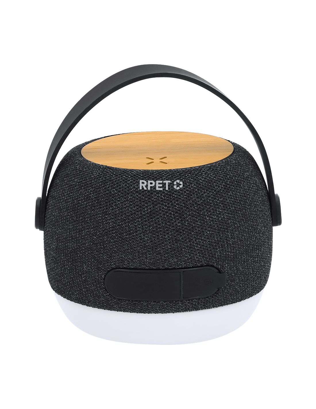 Altavoz cargador Bluetooth con carga inalámbrica de 15W, fabricado en RPET y bambú. Equipado con un sistema de iluminación, con 12 LEDs, que se sincronizan con el ritmo de la música, creando ambientes vibrantes y envolventes. Incluye una práctica y suave asa de silicona para facilitar su transporte. Incluye distintivo RPET.El material RPET se elabora a partir de plástico reciclado, para así fomentar la reutilización de residuos plásticos y ayudar a la sostenibilidad del planeta.Materiales como el Bambú fomentan la utilización de materias primas naturales, reduciendo las emisiones contaminantes. Proviene de una planta de gran resistencia y versatilidad, con crecimiento y regeneración rápidos, siendo una excelente alternativa al uso de madera tradicional.