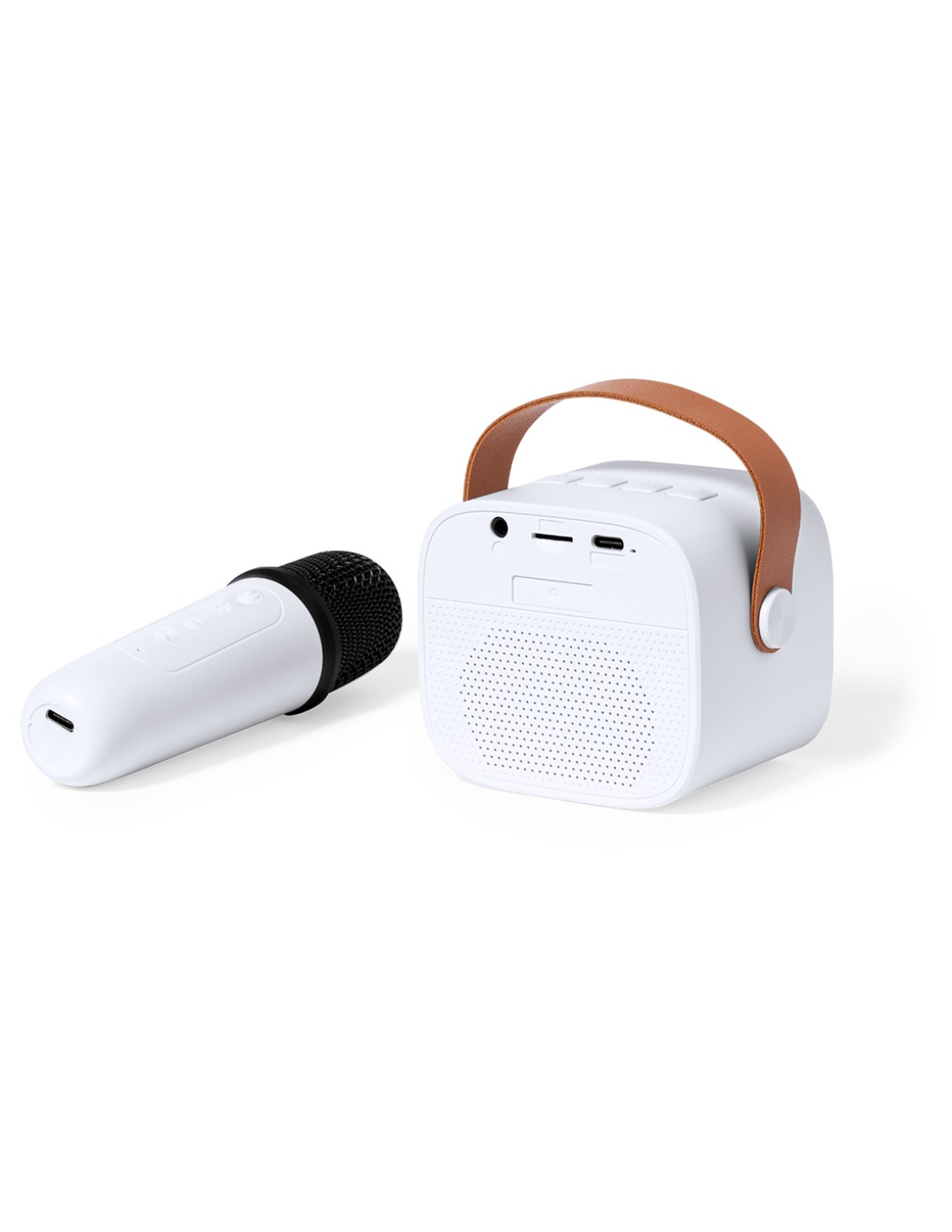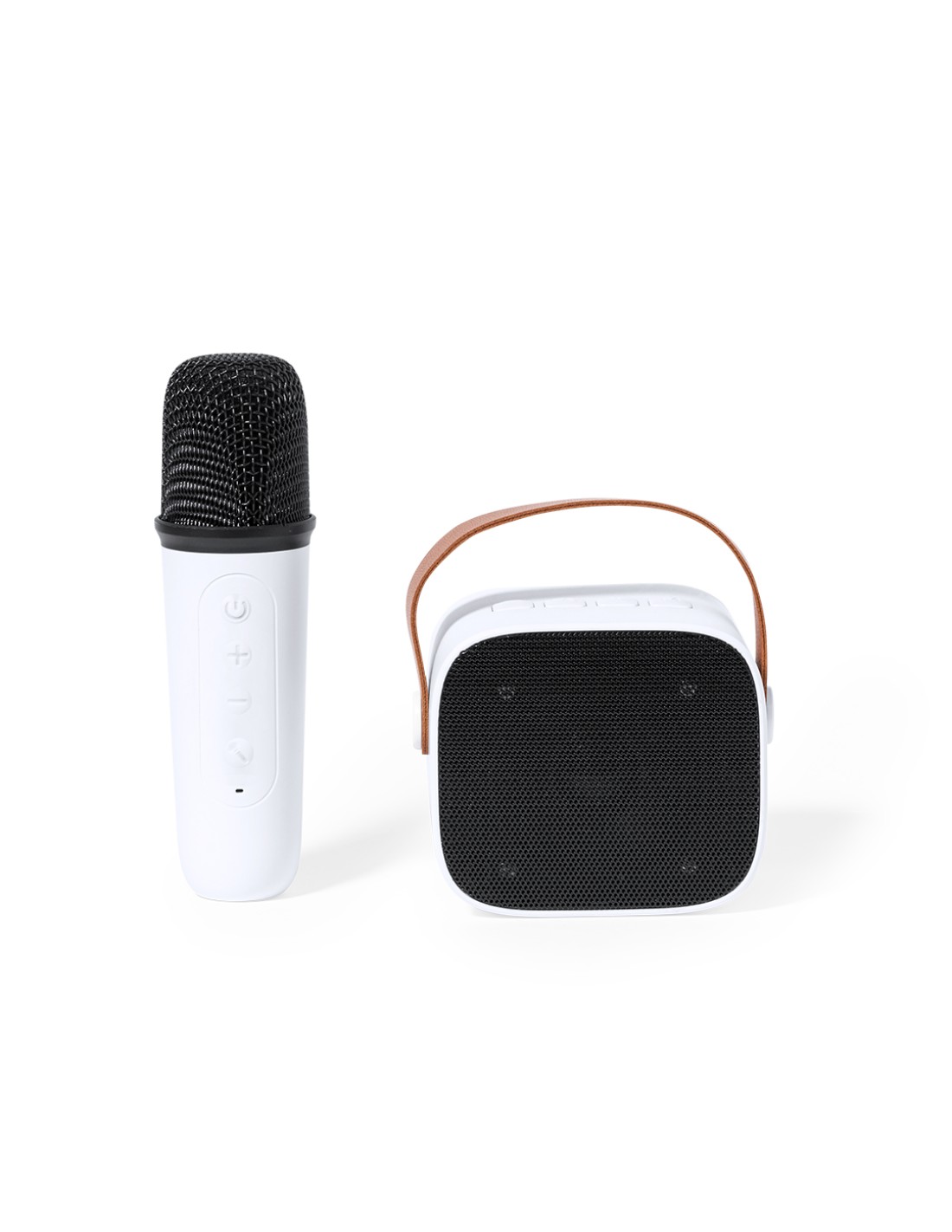 Original pack de karaoke con altavoz y micrófono. Su compacto tamaño y la facilidad de la conexión Bluetooth lo convierte en un ideal accesorio para para disfrutar en cualquier lugar y momento. Incluye:Altavoz con práctica asa de transporte en PU. 5W de potencia y batería de 1200 mAh de larga duración.Micrófono con diseño ergonómico a juego para disfrutar de las mejores canciones.Presentado en caja de diseño Kraft. Disponible manual de instrucciones en español e inglés.