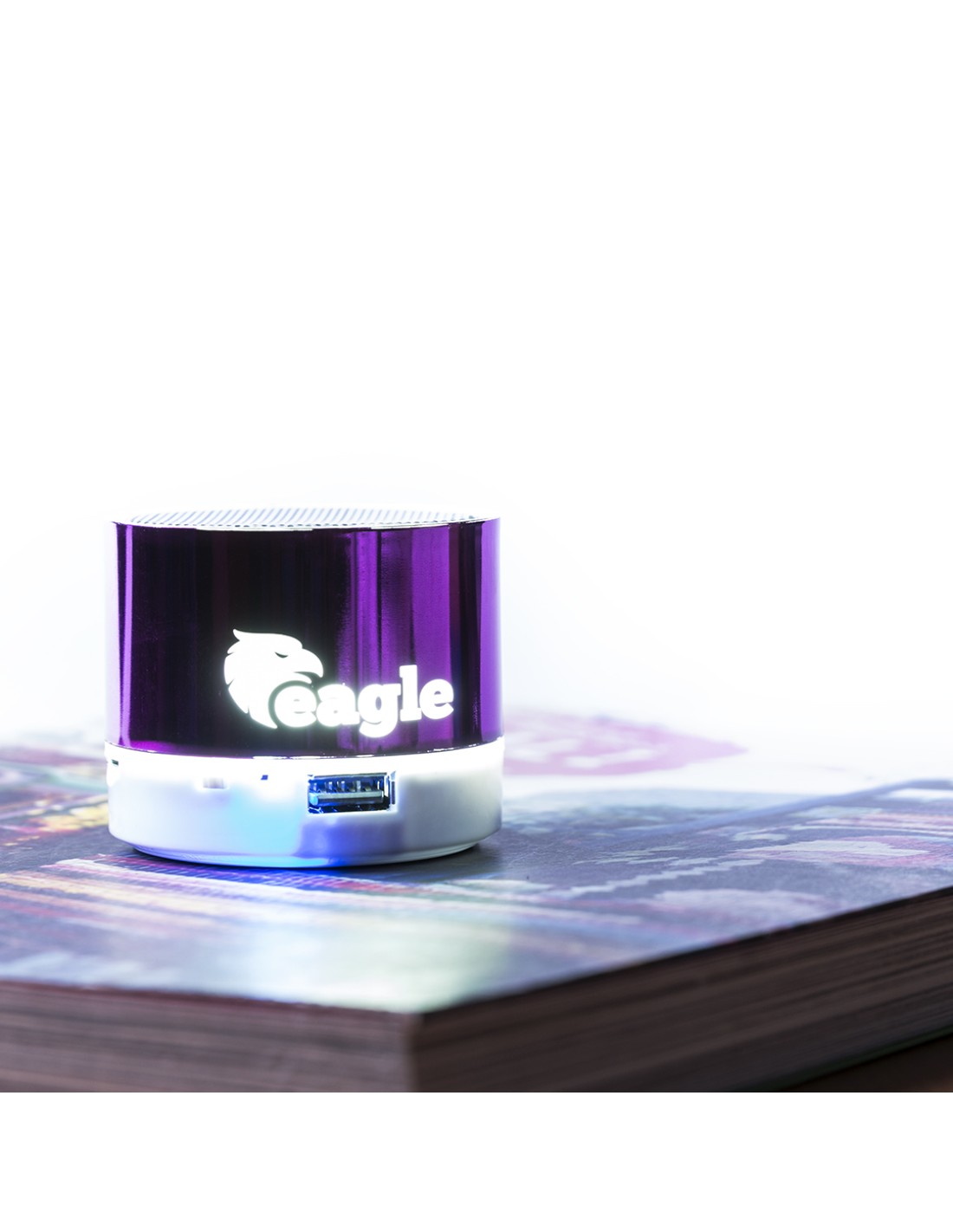 Compacto altavoz de conexión Bluetooth con interior iluminado. Superficie exterior especialmente diseñada para marcaje en láser y así iluminar el logotipo marcado. De diseño bicolor con suave acabado y conexión Bluetooth 3.0, ofrece 3W de potencia, tiene función de manos libres, una ranura para tarjetas micro SD de hasta 32 GB de capacidad, función radio FM, entrada auxiliar de línea mediante conexión jack de 3,5mm y soportes de goma antideslizantes en la base. Compatible con iOS y Android, incluye cable de carga mini USB, cable auxiliar jack de 3,5mm y viene presentado en atractiva caja de diseño. Con base antideslizante.