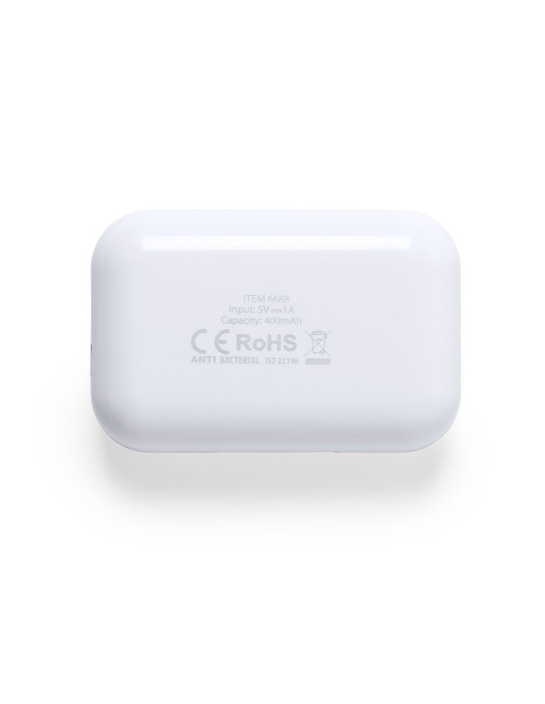 Auriculares antibacterianos intraurales en elegante acabado blanco y conexión Bluetooth 5.0. Fabricados en resistente material ABS brillo y de diseño ergonómico, incluyen botón de control táctil integrado en el auricular, con base de carga a juego. Función manos libres y recargables, con cable micro USB incluido. Presentados en estuche individual de lujo con tapa de bisagra y en atractiva caja de diseño. Los productos con tratamientos antibacterianos son capaces de reducir drásticamente las cargas bacterianas presentes en las superficies de los materiales, gracias a la incorporación de agentes microbianos permanentes estáticos, con alta efectividad para inhibir y prevenir la contaminación bacteriana. Artículo de acuerdo al estándar ISO 22196, que determina la actividad antibacteriana en materiales plásticos y superficies no porosas, lo que permite conocer la efectividad de inhibición microbiana que tienen los aditivos sobre los objetos tratados mediante una evaluación cuantitativa.