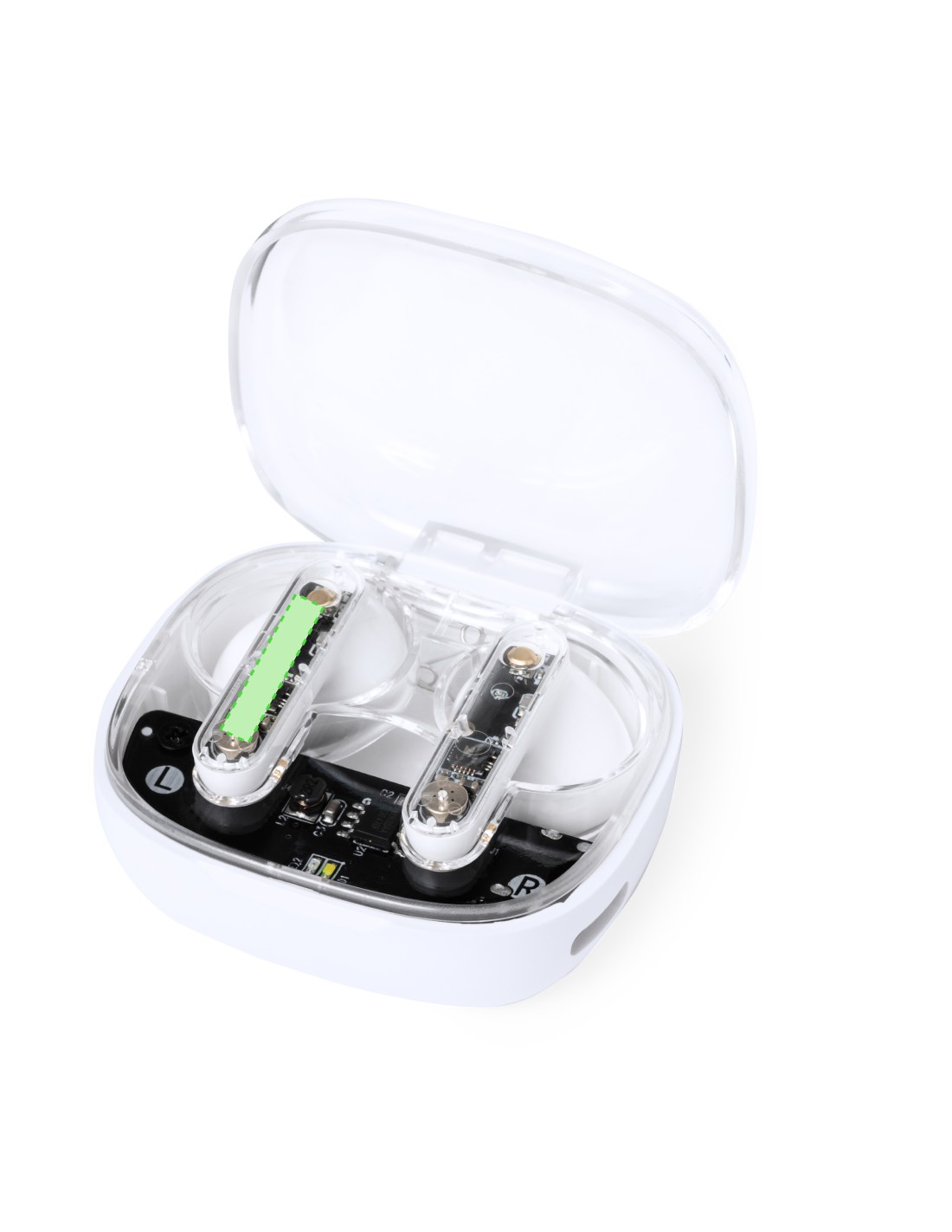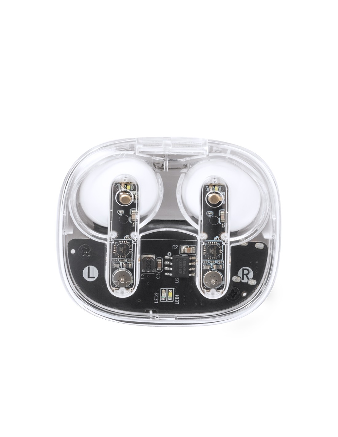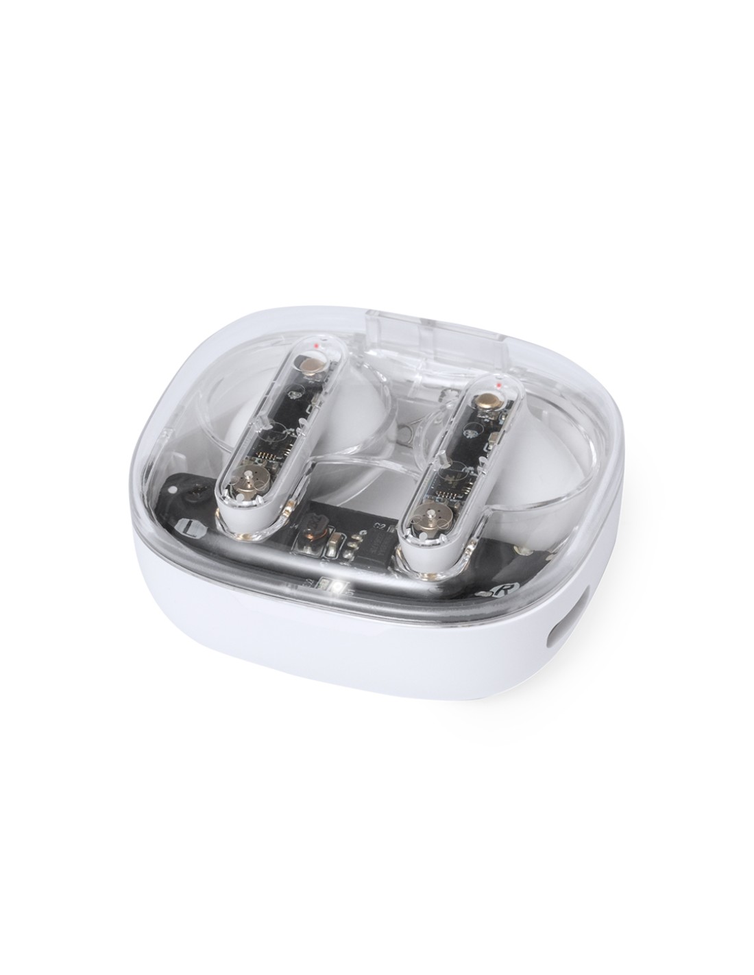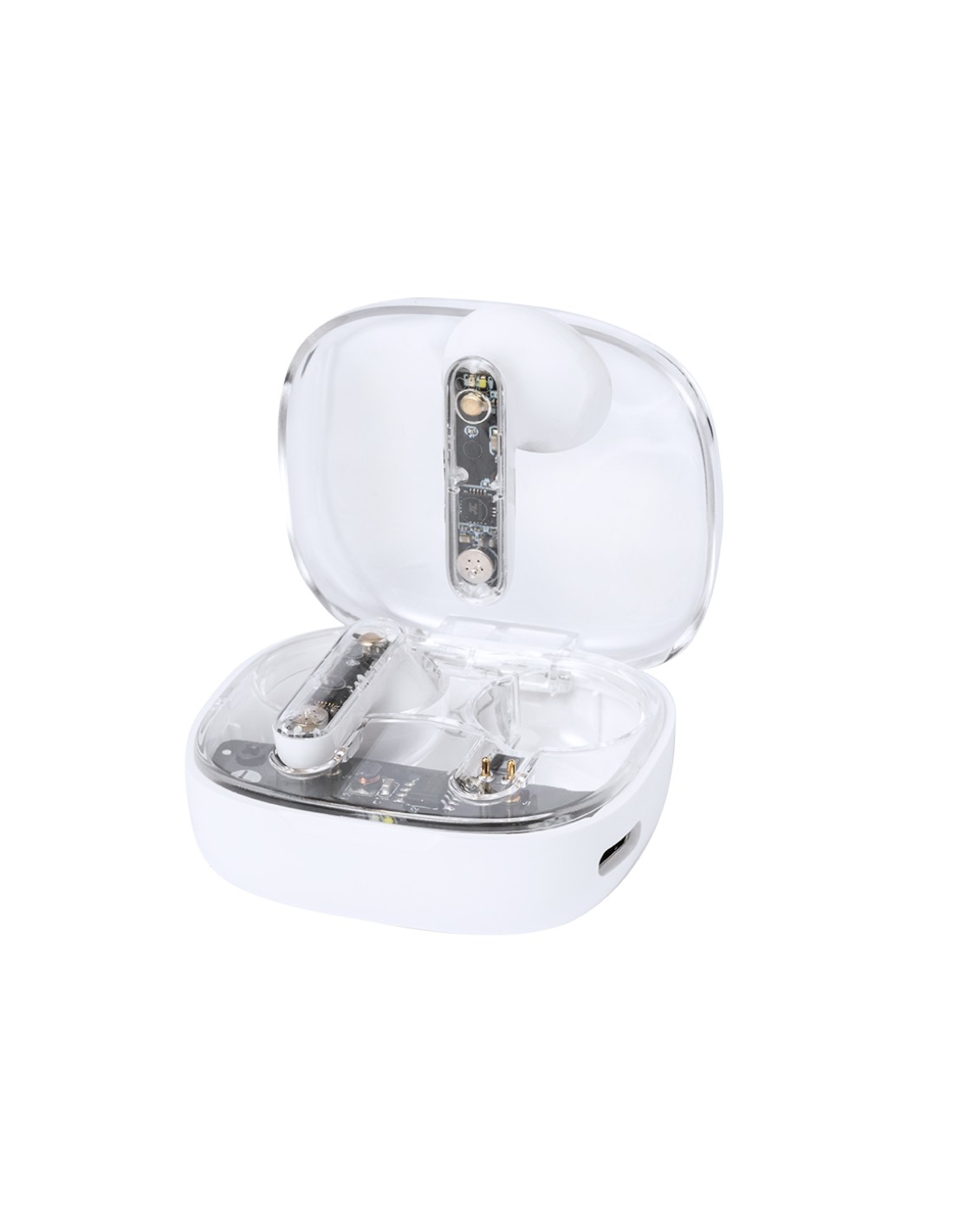 Auriculares intraurales en distintivo diseño transparente. Conexión Bluetooth 5.3 y gran autonomía . De diseño ergonómico, incluyen botón de control táctil integrado en el auricular, con base de carga a juego e indicadores de estado de carga. Función manos libres. Puerto de carga con entrada Tipo C (cable incluido). Presentados en caja individual de diseño kraft y en bolsa reciclada.