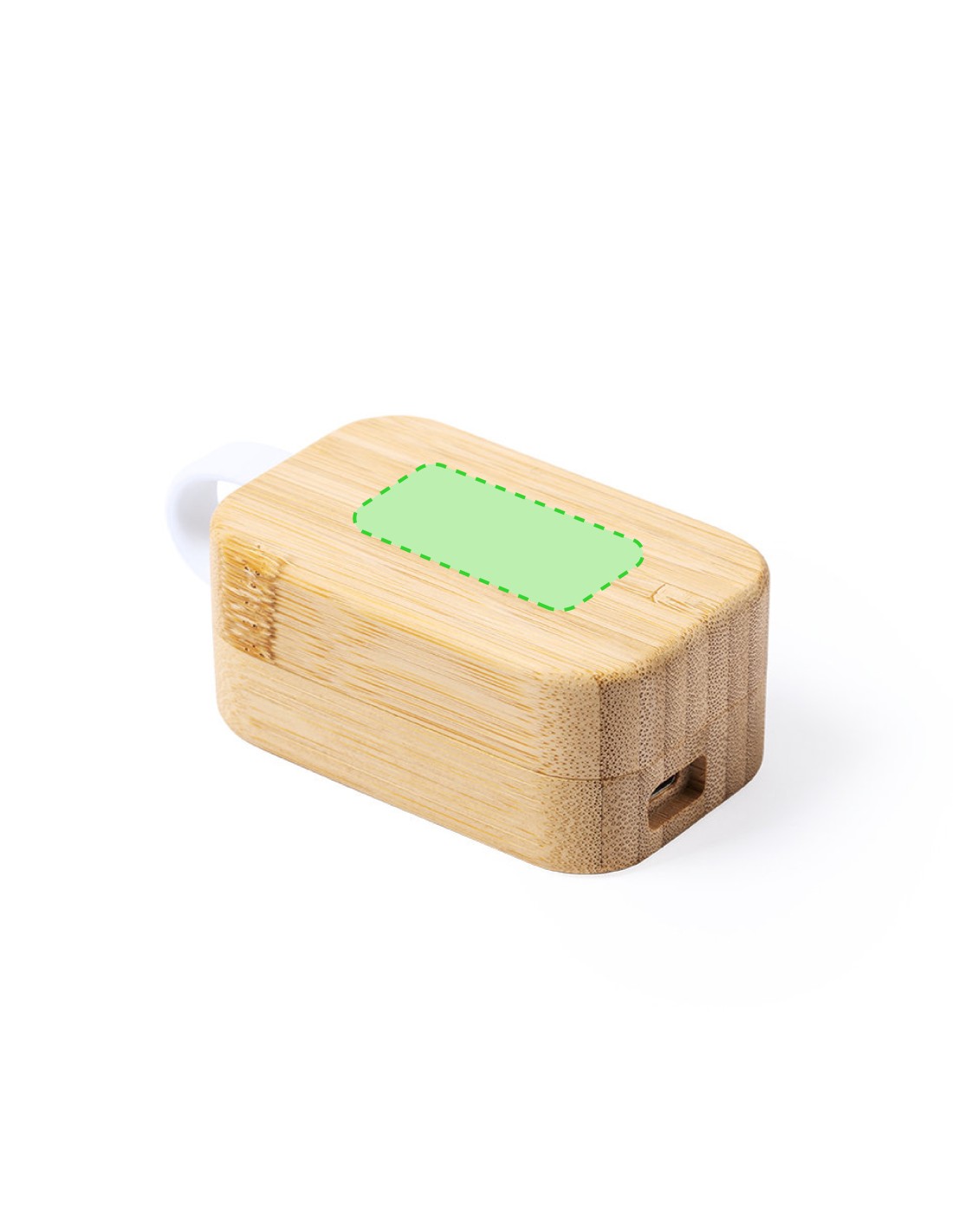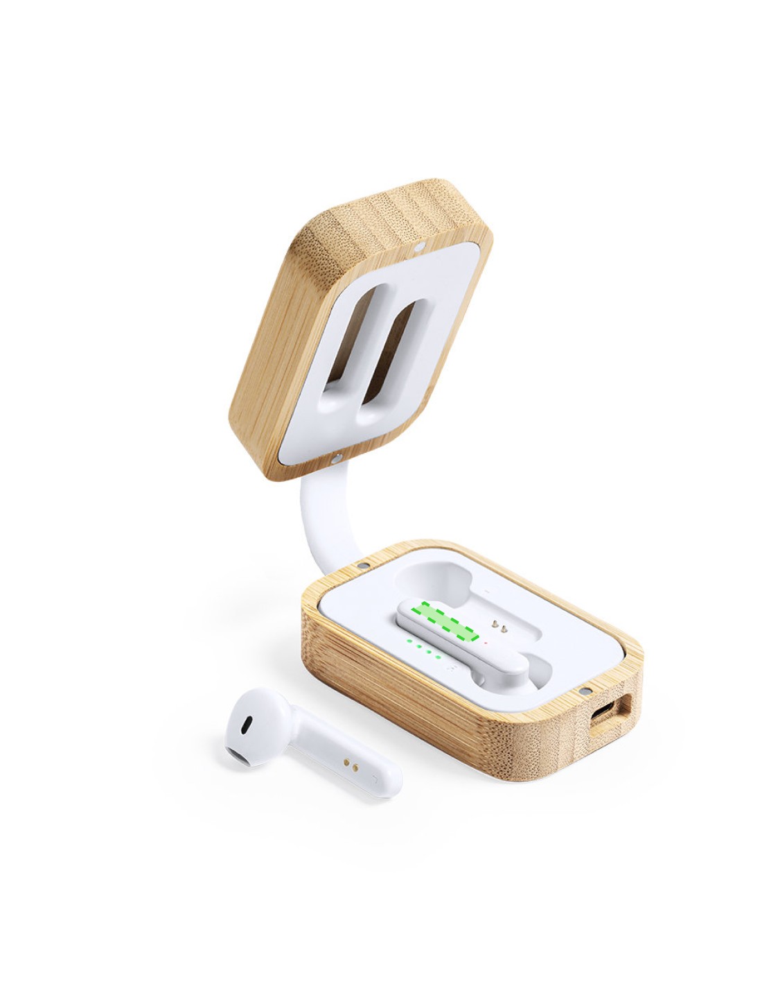 Auriculares intraurales de línea nature, con conexión Bluetooth 5.0 y batería de litio. En elegante acabado de color blanco y presentados en estuche cargador de bambú. De diseño ergonómico, incluyen botón de control táctil integrado en el auricular, con base de carga a juego y luz LED de estado de carga. Función manos libres y recargables, con cable micro USB incluido. Presentados en atractiva caja de diseño eco.