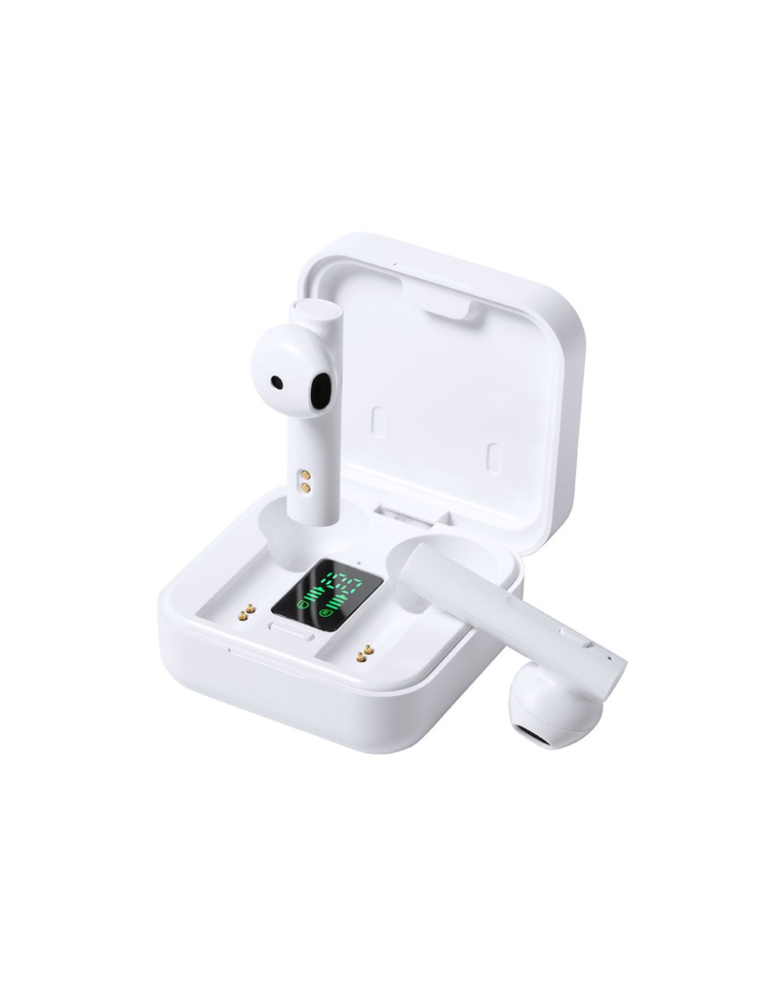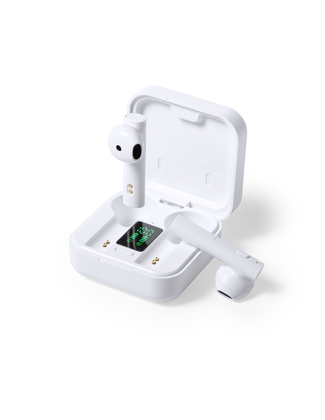 Auriculares intraurales en elegante acabado blanco y conexión Bluetooth 5.0. Con panel de carga solar integrado en la tapa y pantalla LCD interior con indicador de estado de carga. De diseño ergonómico, incluyen botón de control integrado en el auricular, con base a juego. Función manos libres y recargables con energía solar o mediante cable micro USB -incluido-. Presentados en estuche individual premium con apertura de bisagra y en atractiva caja de diseño, con manual de instrucciones en español e inglés.