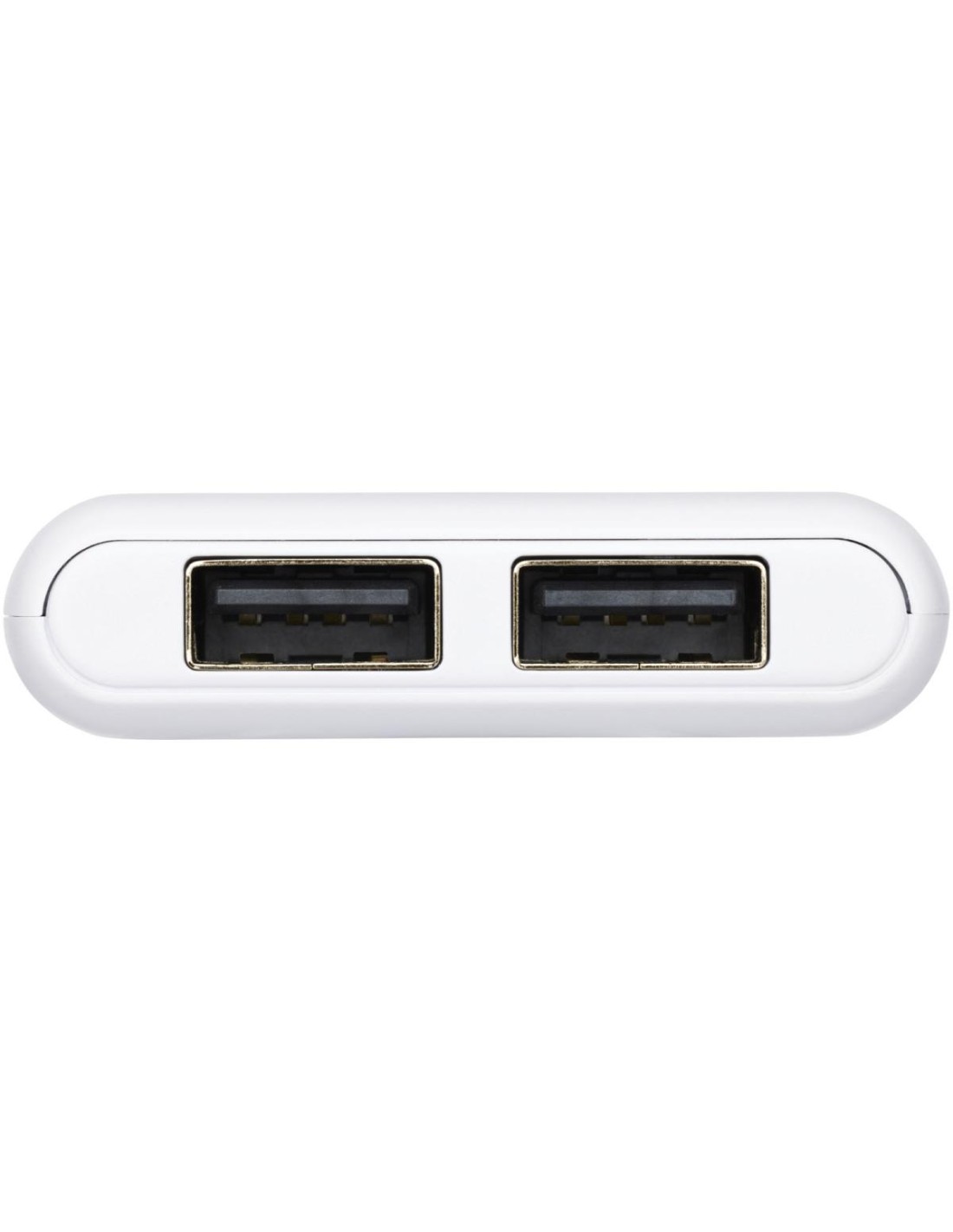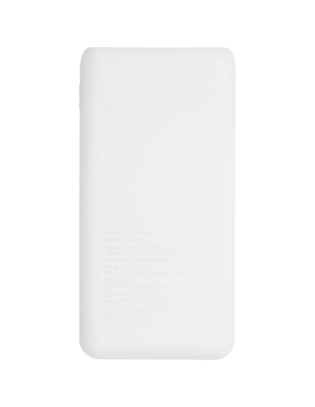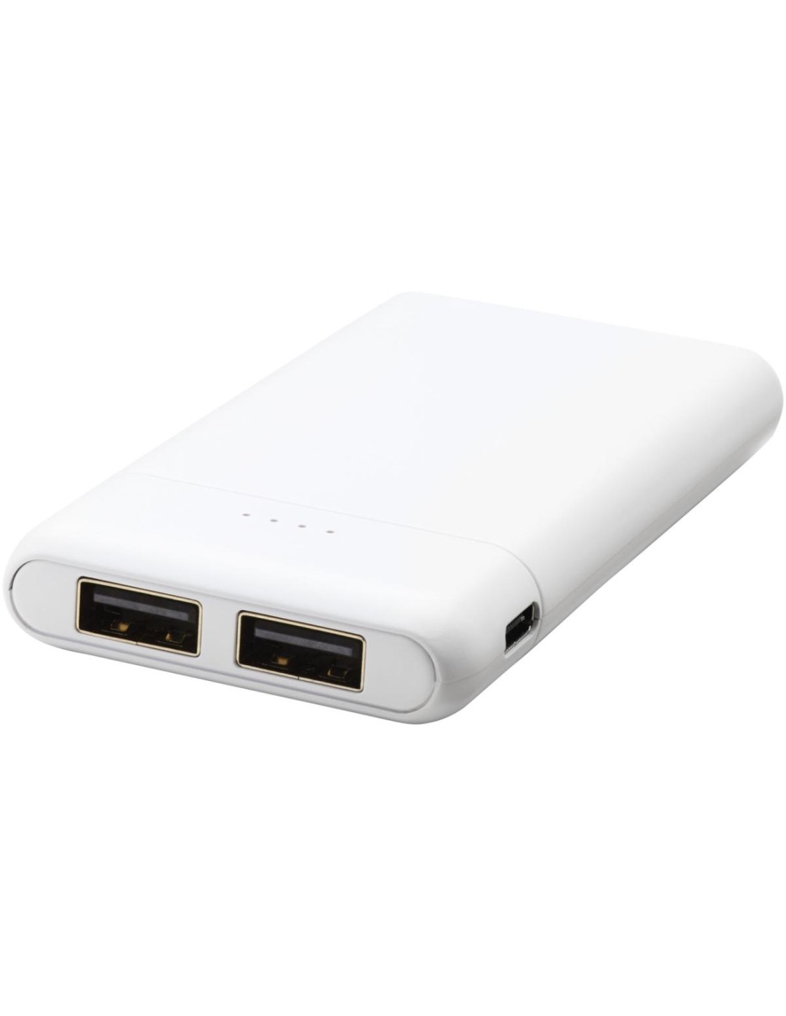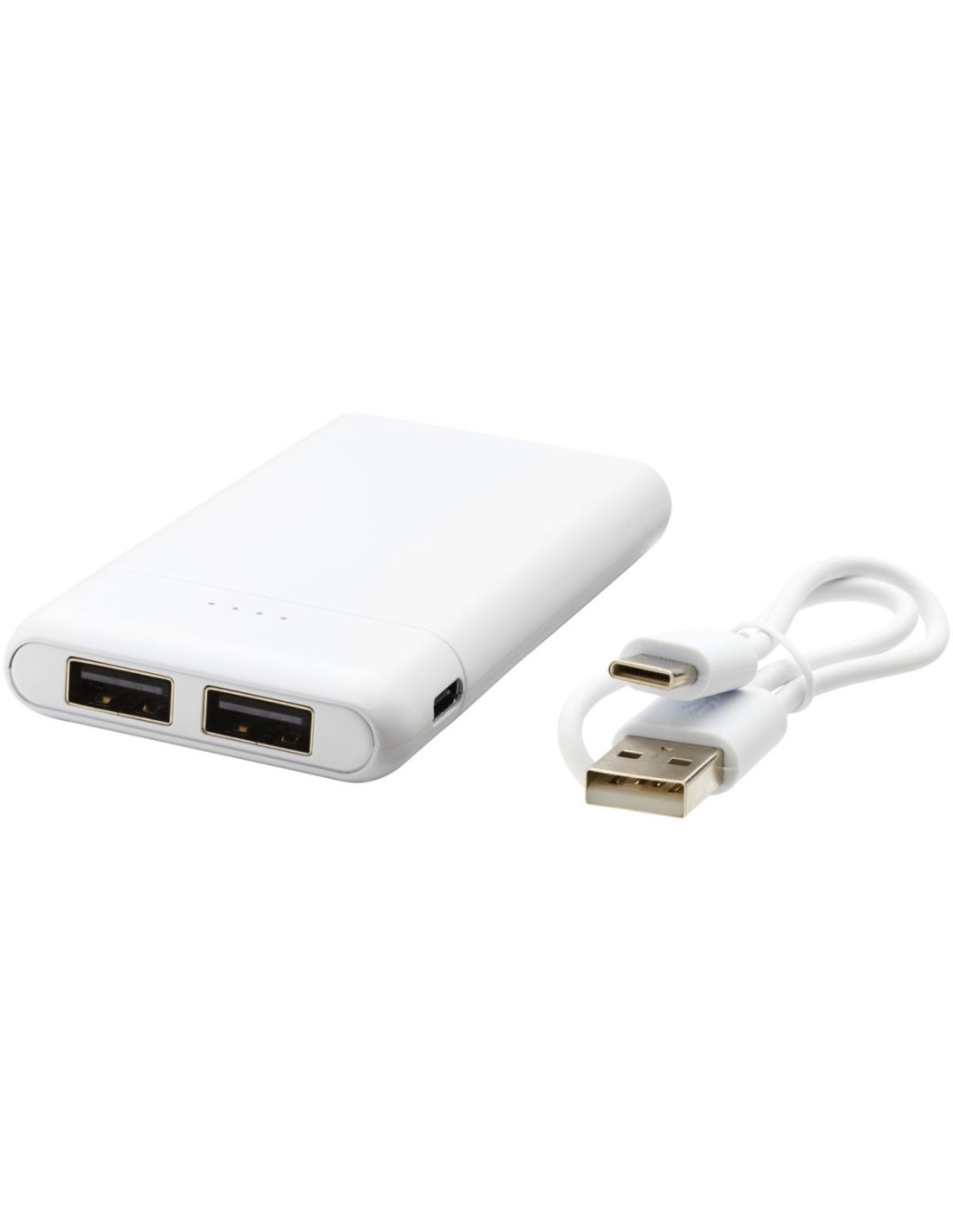 Batería externa de bolsillo de alta densidad de 5000 mAh. Entrada tipo C (5 V/2 A) y doble salida USB A (5 V/2 A). Incluye cable de carga de plástico TPE sin PVC. Se entrega en una caja de regalo .