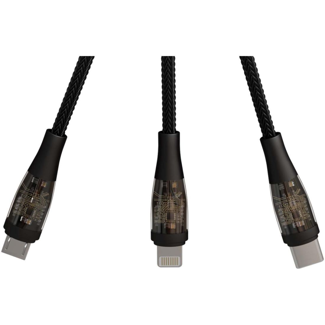 Cable de carga rápida y transferencia de datos 5 en 1. Entrada: USB-A/USB-C. Salida: Micro USB/Tipo C/Lightning. Carga rápida: 100 W/5A. Conectores transparentes. Pantalla digital con velocidad de transferencia en la parte delantera y logotipo luminoso en la parte trasera.