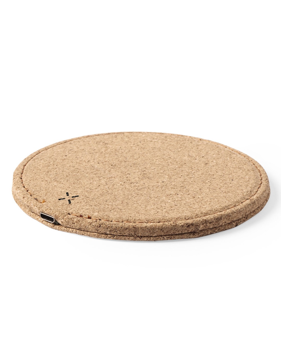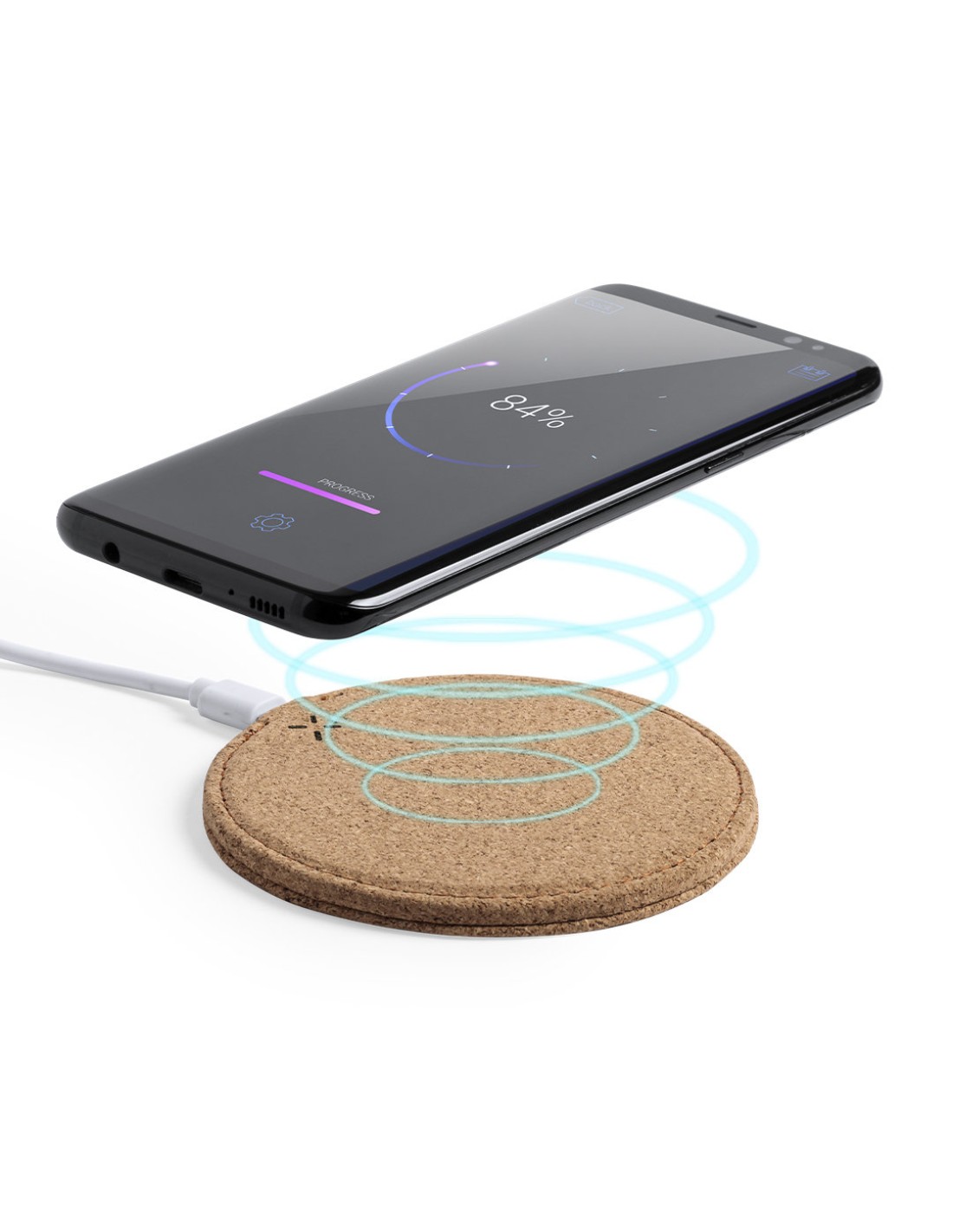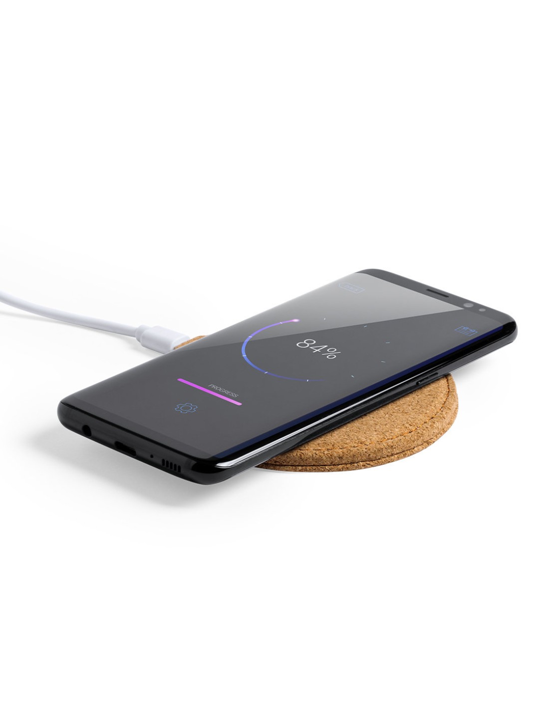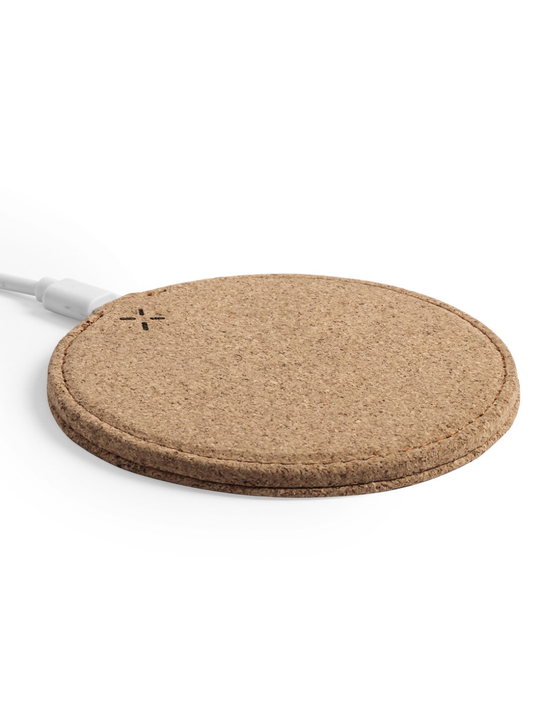 Cargador inalámbrico de línea nature y diseño circular fabricado en corcho natural, cuyos procesos de extracción tienen un mínimo impacto sobre el...