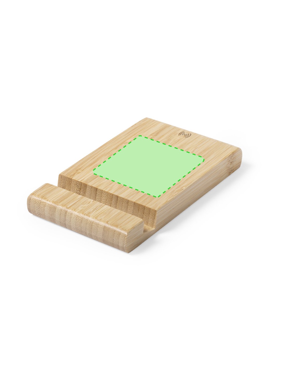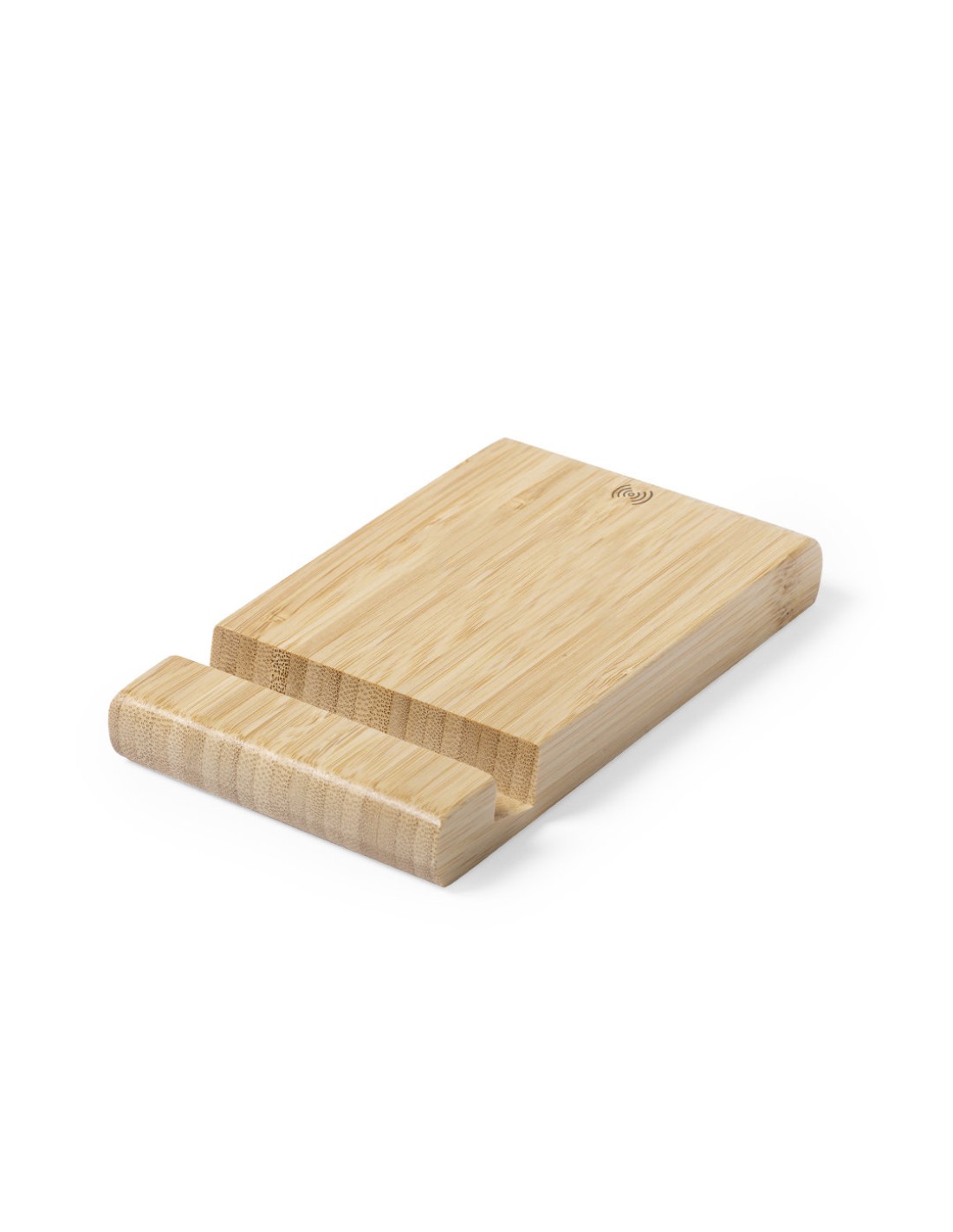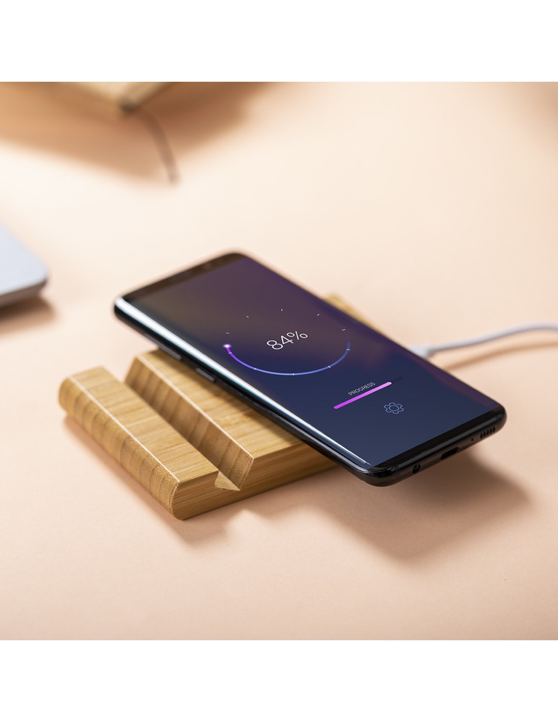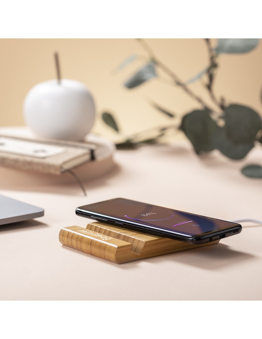 Cargador inalámbrico 15W de línea nature, con soporte integrado para smartphones y tablets. Carcasa en bambú procedente de cortes naturales. Incluye cable micro USB de 1m y es compatible con dispositivos equipados con tecnología de carga inalámbrica. Con amplia superficie de marcaje, presentado en atractiva caja de diseño eco.