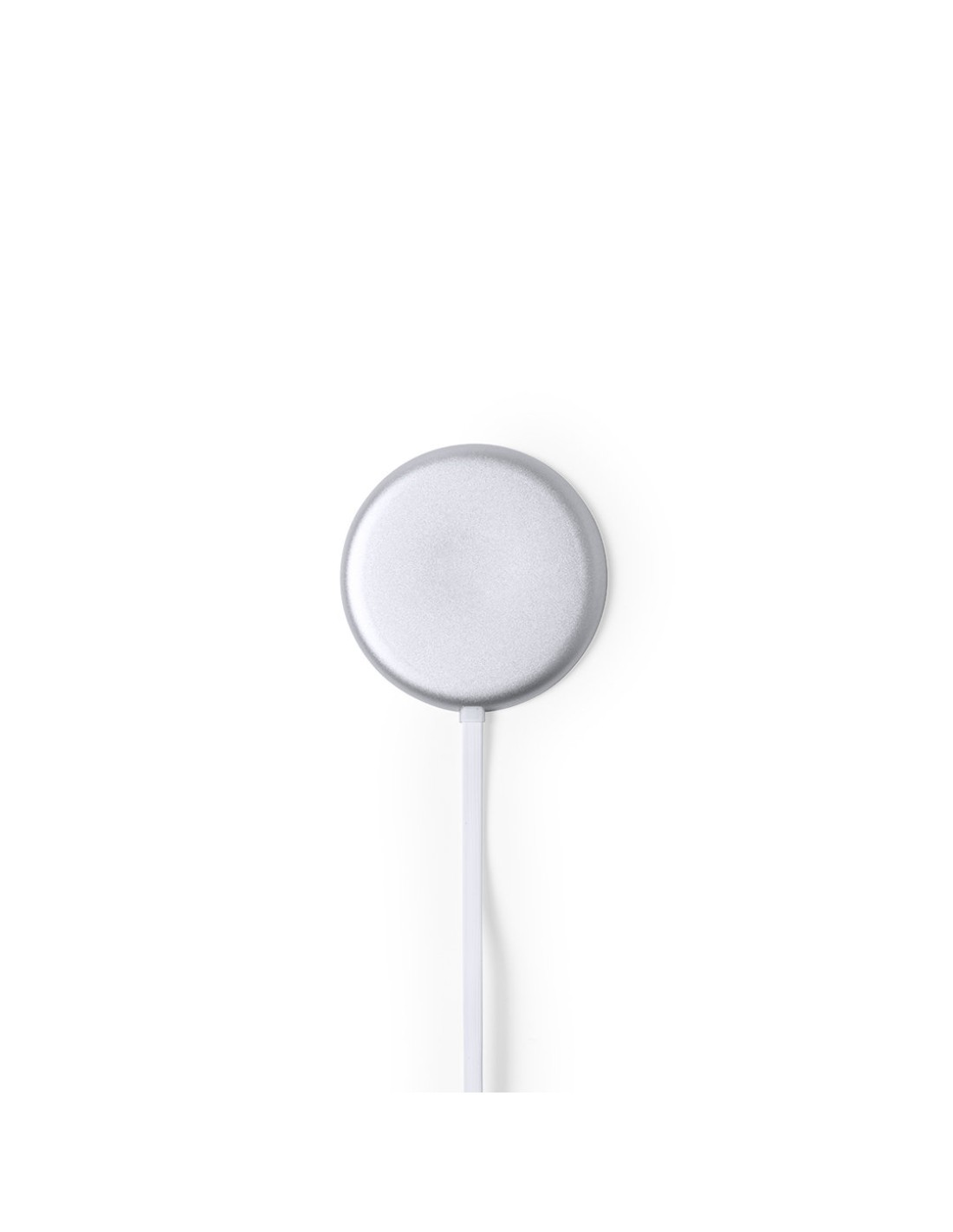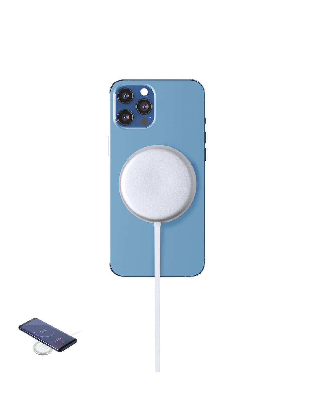Cargador inalámbrico magnético 10W. Carcasa fabricada en resistente aluminio de acabado plateado. Con indicador de estado de carga y cable USB de 1m con conector de aluminio. Incluye accesorio metálico con adhesivo 3M, de fijación extra fuerte y libre de residuo al despegarlo del dispositivo, permitiendo así el uso de la función magnética del cargador en cualquier dispositivo móvil. Compatible con terminales equipados con tecnología de carga inalámbrica. Amplia superficie de marcaje y presentado en atractiva caja de diseño. Disponible manual de instrucciones en español e inglés.