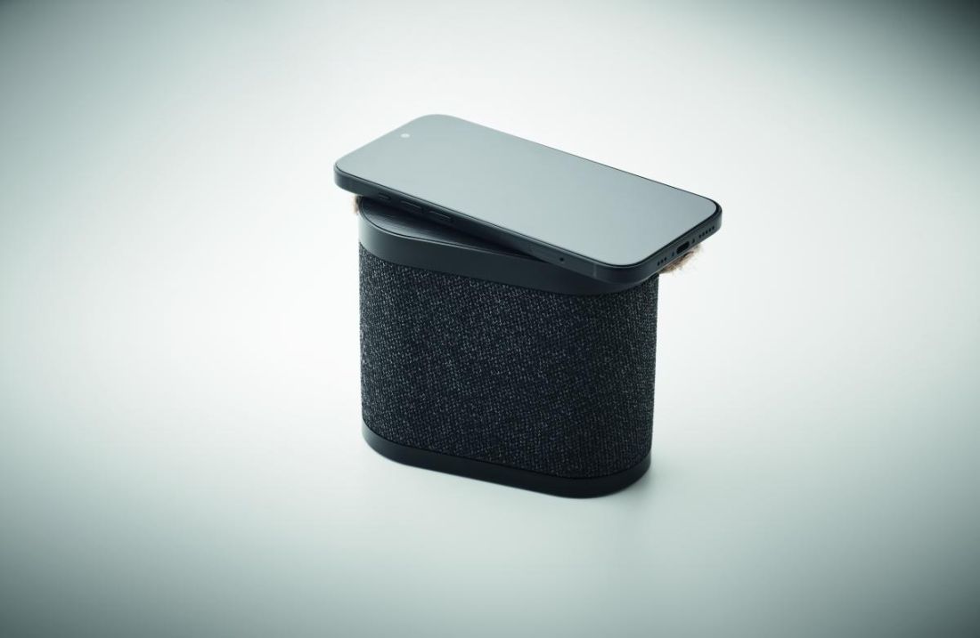 Altavoz inalámbrico 5.3 de 15 W en ABS con acabado en tejido de poliéster RPET y parte superior de bambú con asa de yute. Batería recargable de iones de litio de 1200 mAh. Datos de salida: 5W, 4 Ohm y 5V. Tiempo de reproducción aprox. 4h.