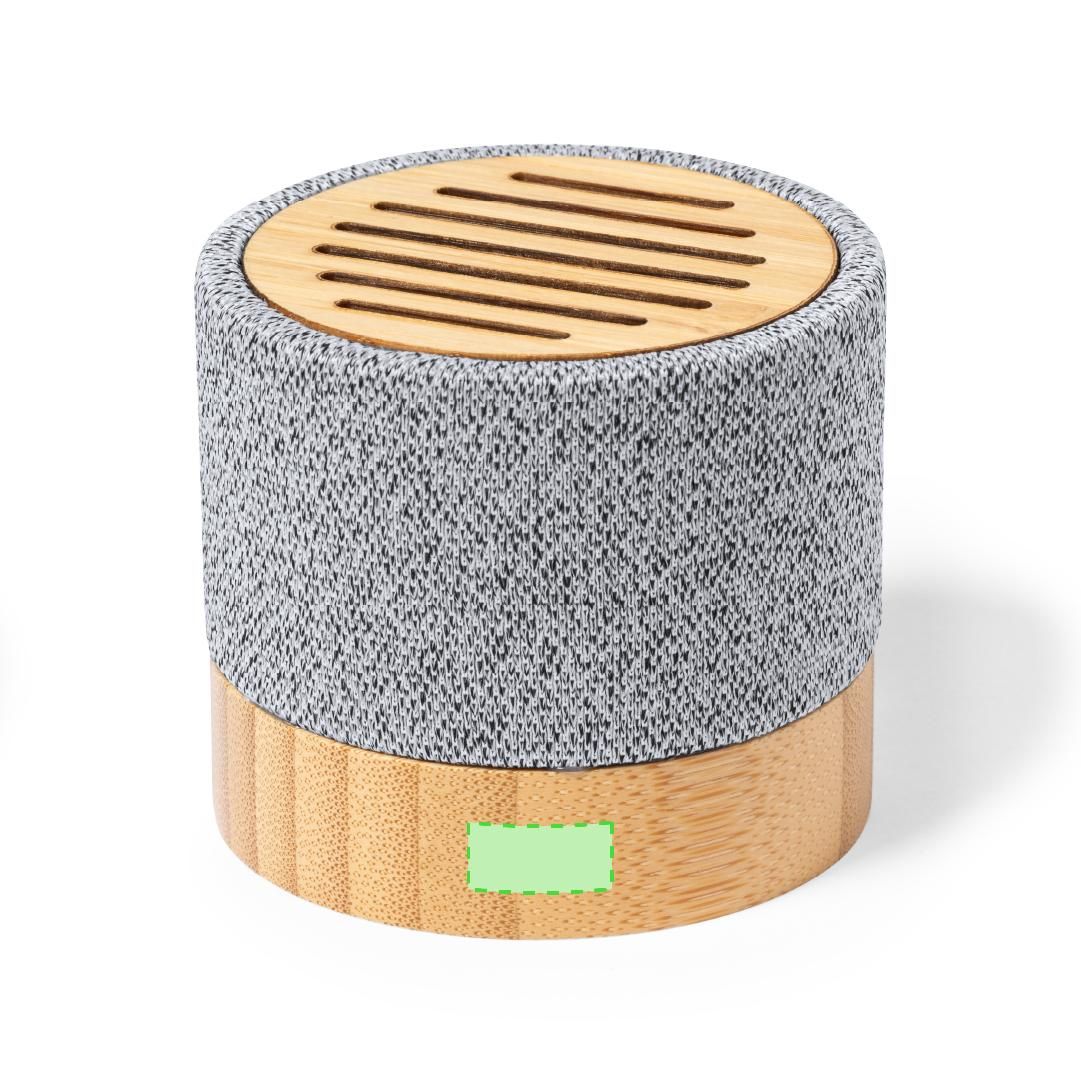 Compacto altavoz de línea nature y conexión Bluetooth. Carcasa fabricada en bambú y poliéster RPET, elaborado a partir de plástico reciclado, para...