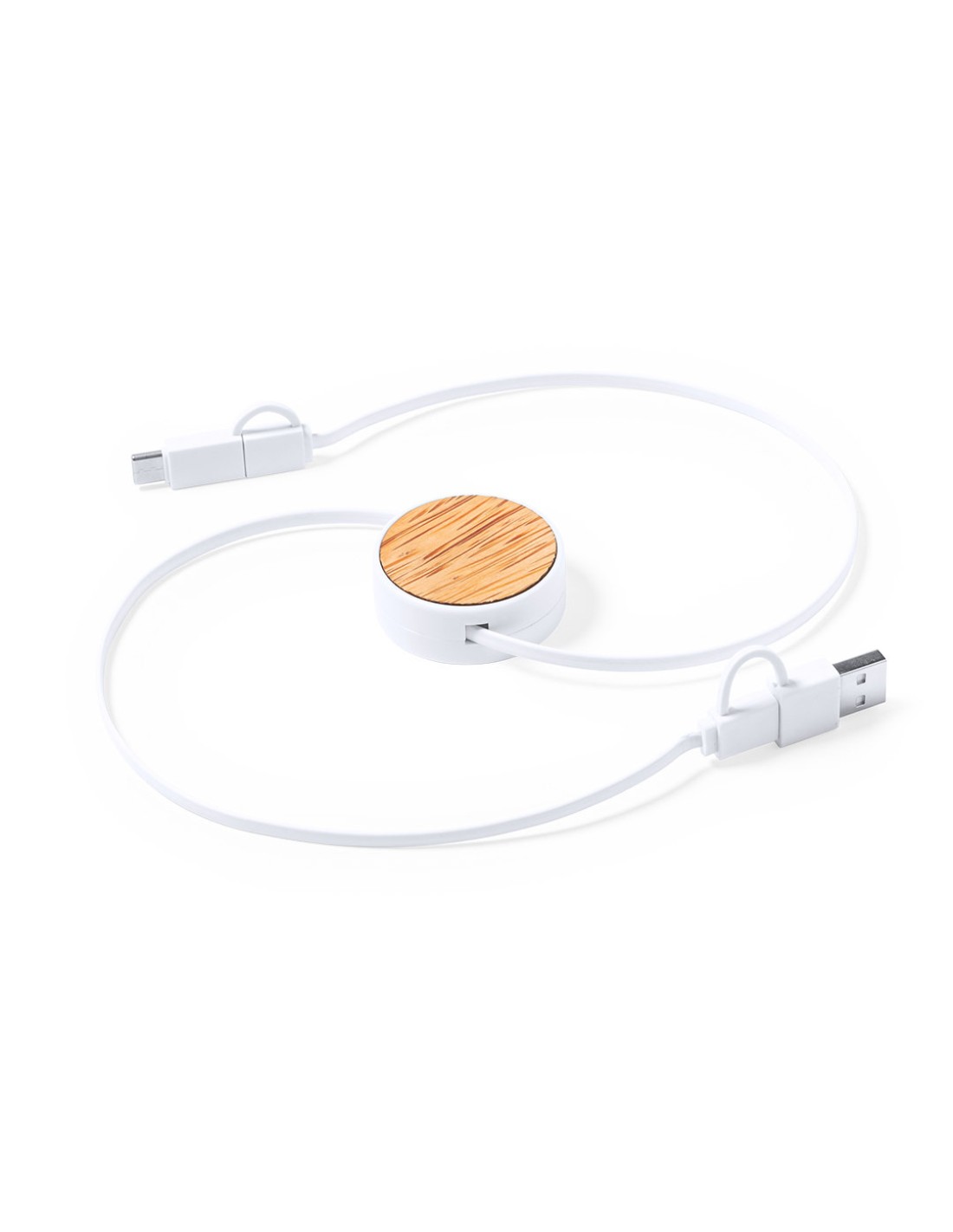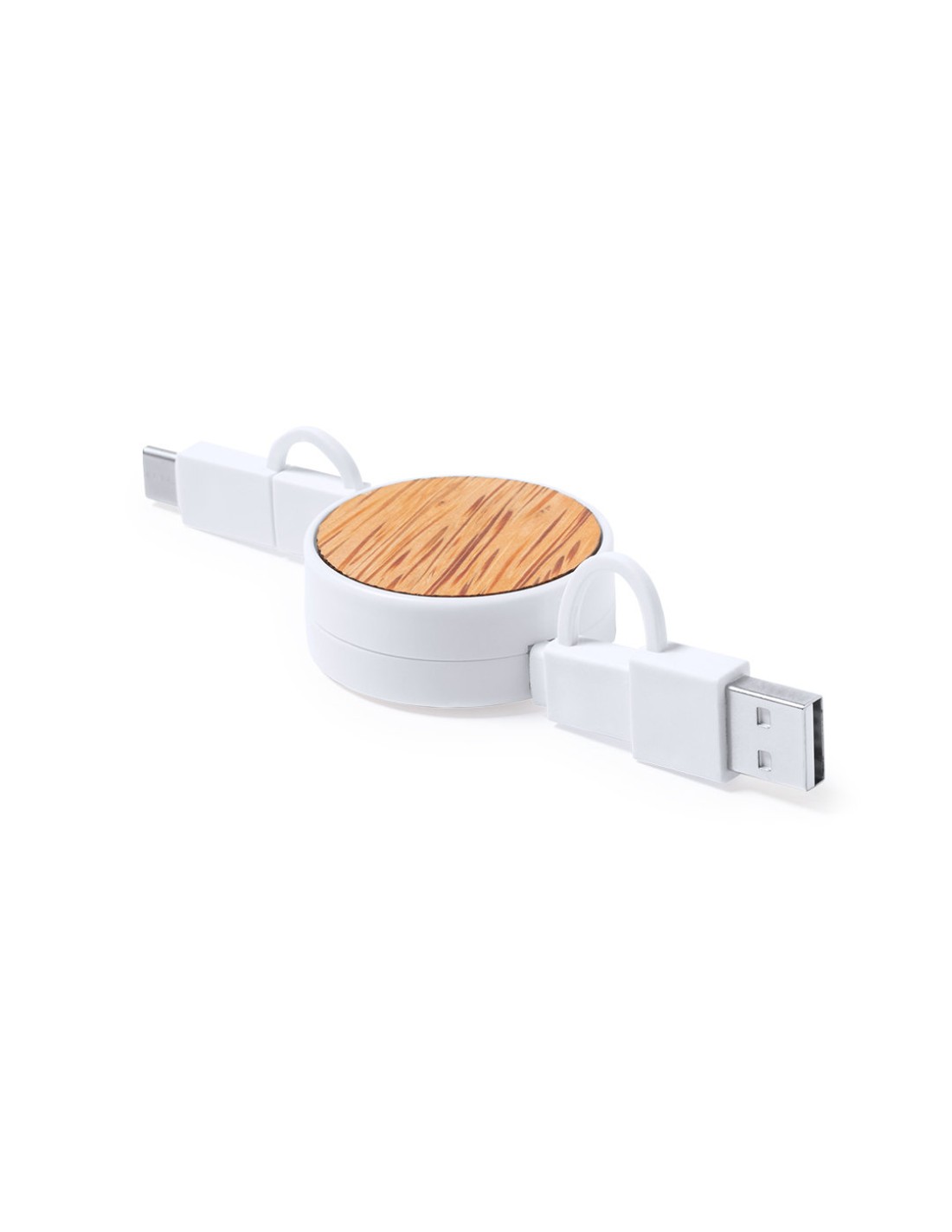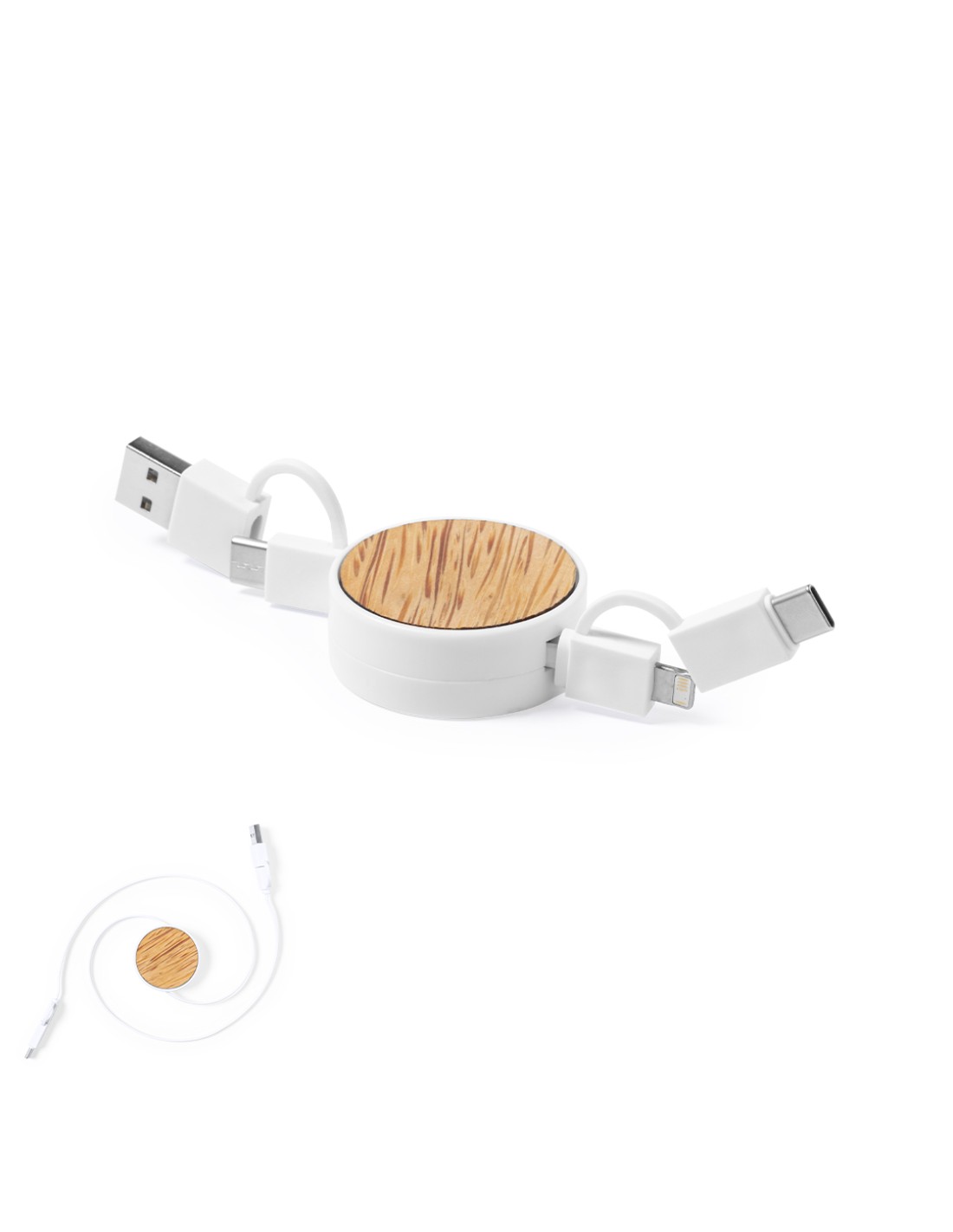 Cable extensible USB con función cargador y de transferencia de datos. De línea nature y fabricado en coco del que, tras el consumo de su fruto, se pueden obtener multitud de productos, contribuyendo a la sostenibilidad del planeta y fomentando el uso de materias primas naturales. Conexiones Tipo C (entrada y salida), y dual Micro USB/Lightning. Con zona lisa para marcaje y presentado en caja individual de diseño eco en cartón kraft.