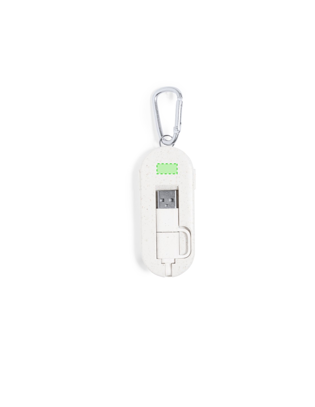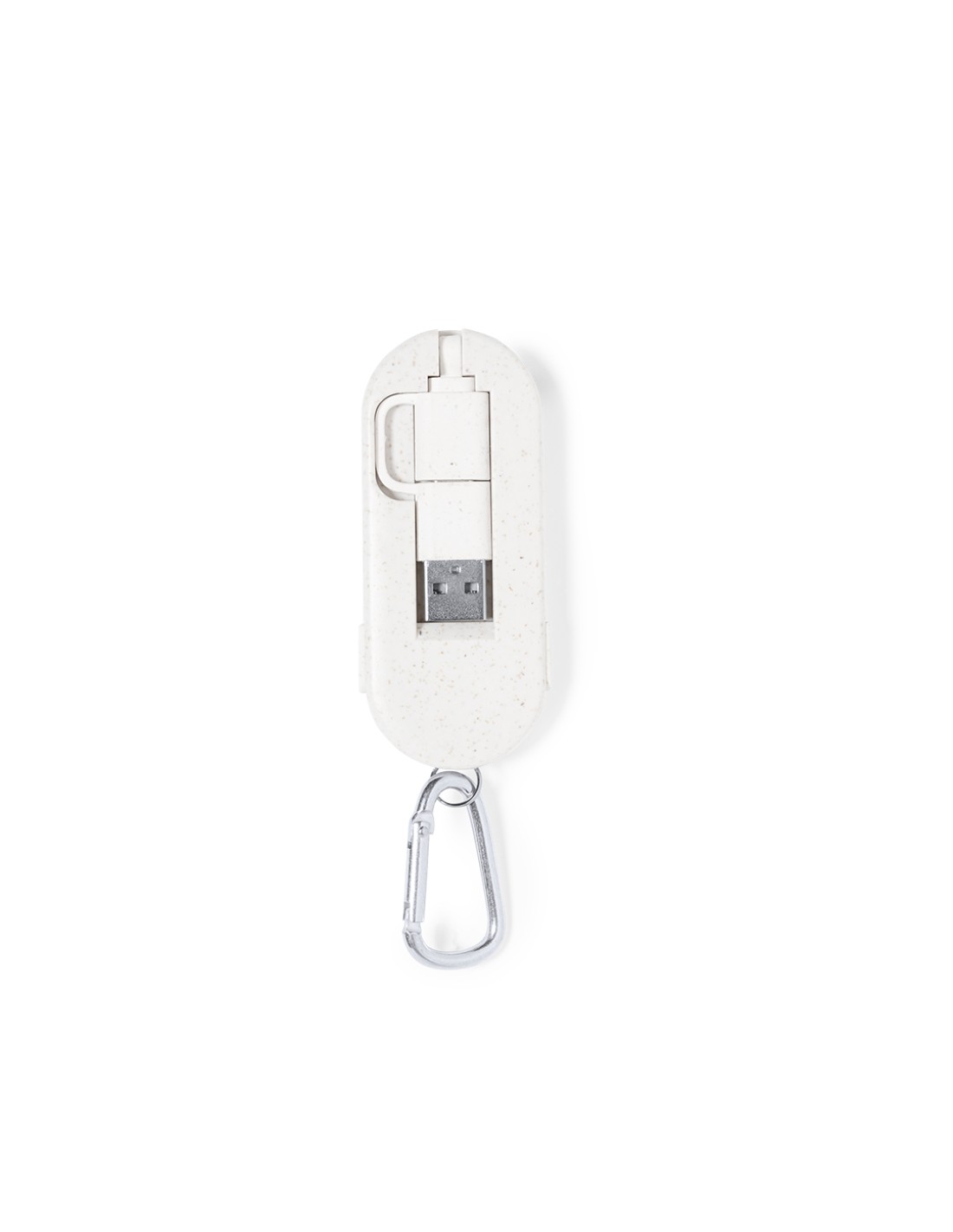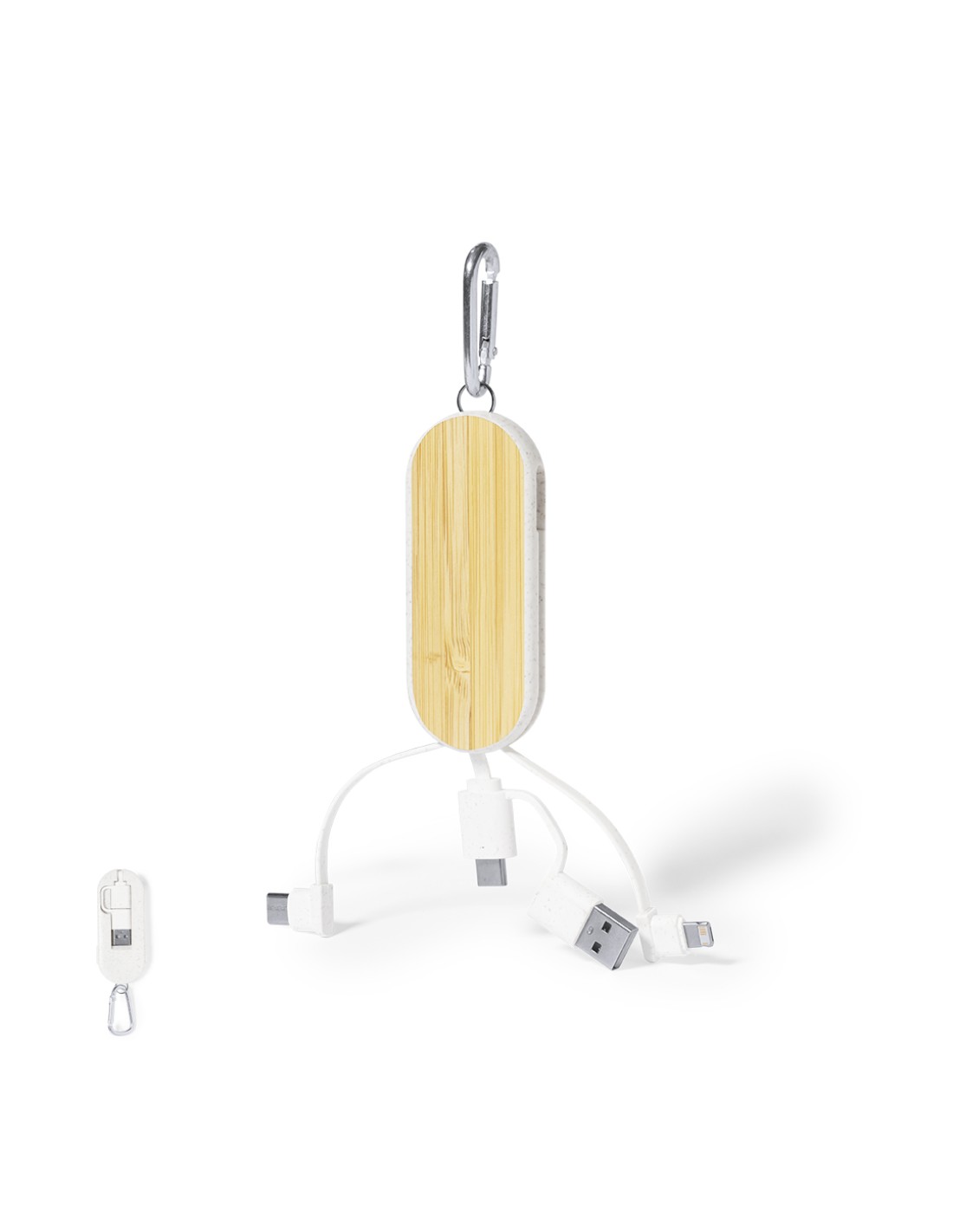 Cable cargador con mosquetón fabricado en fibra de trigo y bambú. Con conexiones de entrada Tipo C y USB y salidas Tipo C, lightning y Micro USB. 5V DC 2A. Presentado en bolsa individual de diseño kraft.Elaborado con elementos vegetales para así fomentar la utilización de materias primas naturales y reducir las emisiones contaminantes.