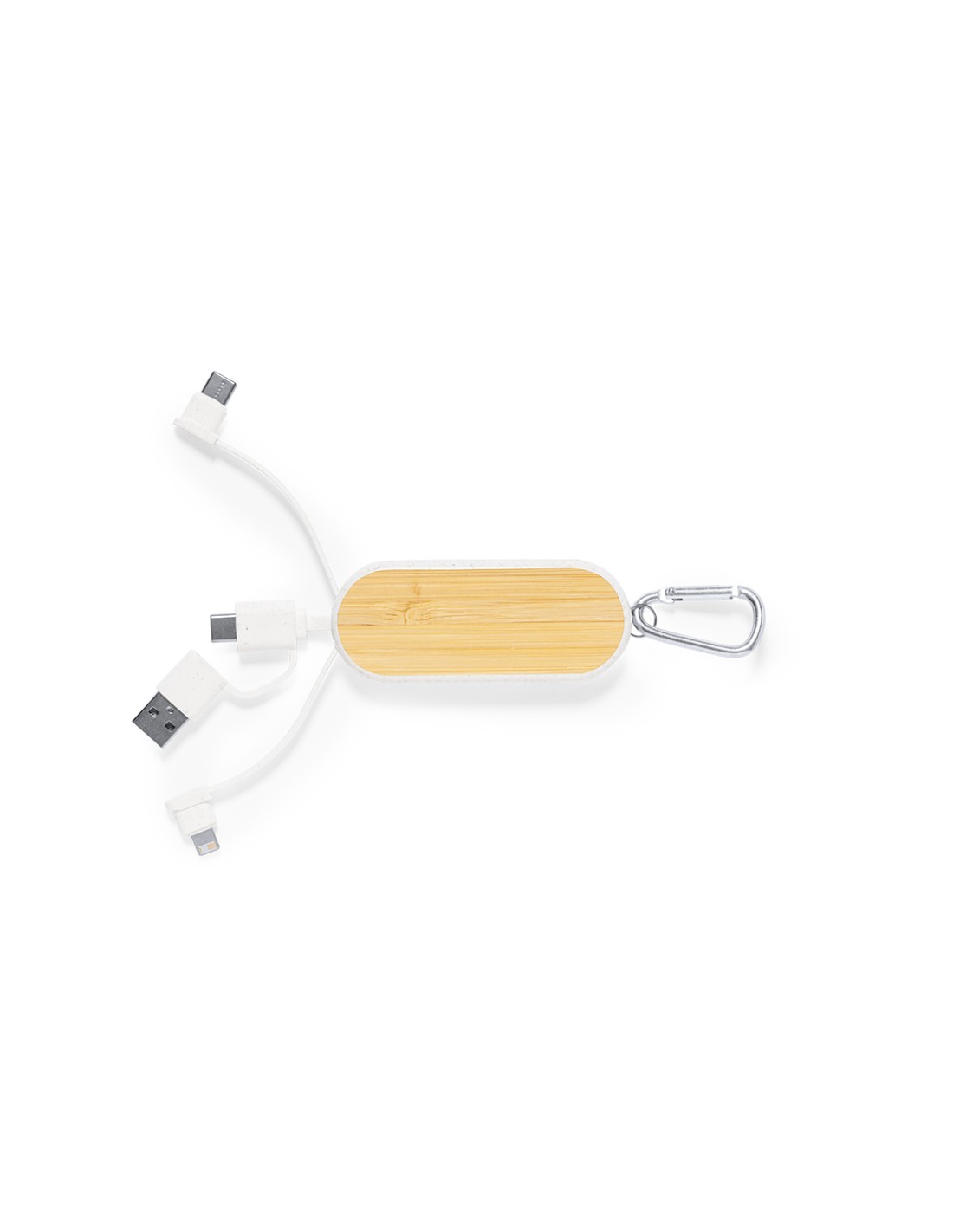 Cable cargador con mosquetón fabricado en fibra de trigo y bambú. Con conexiones de entrada Tipo C y USB y salidas Tipo C, lightning y Micro USB. 5V...