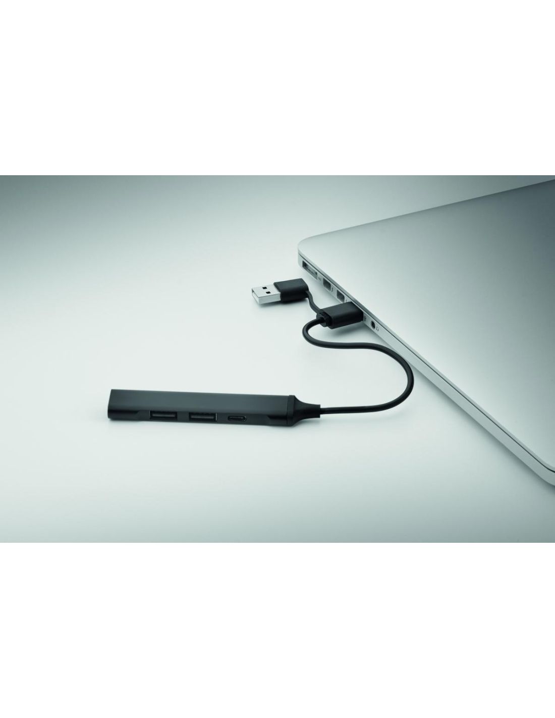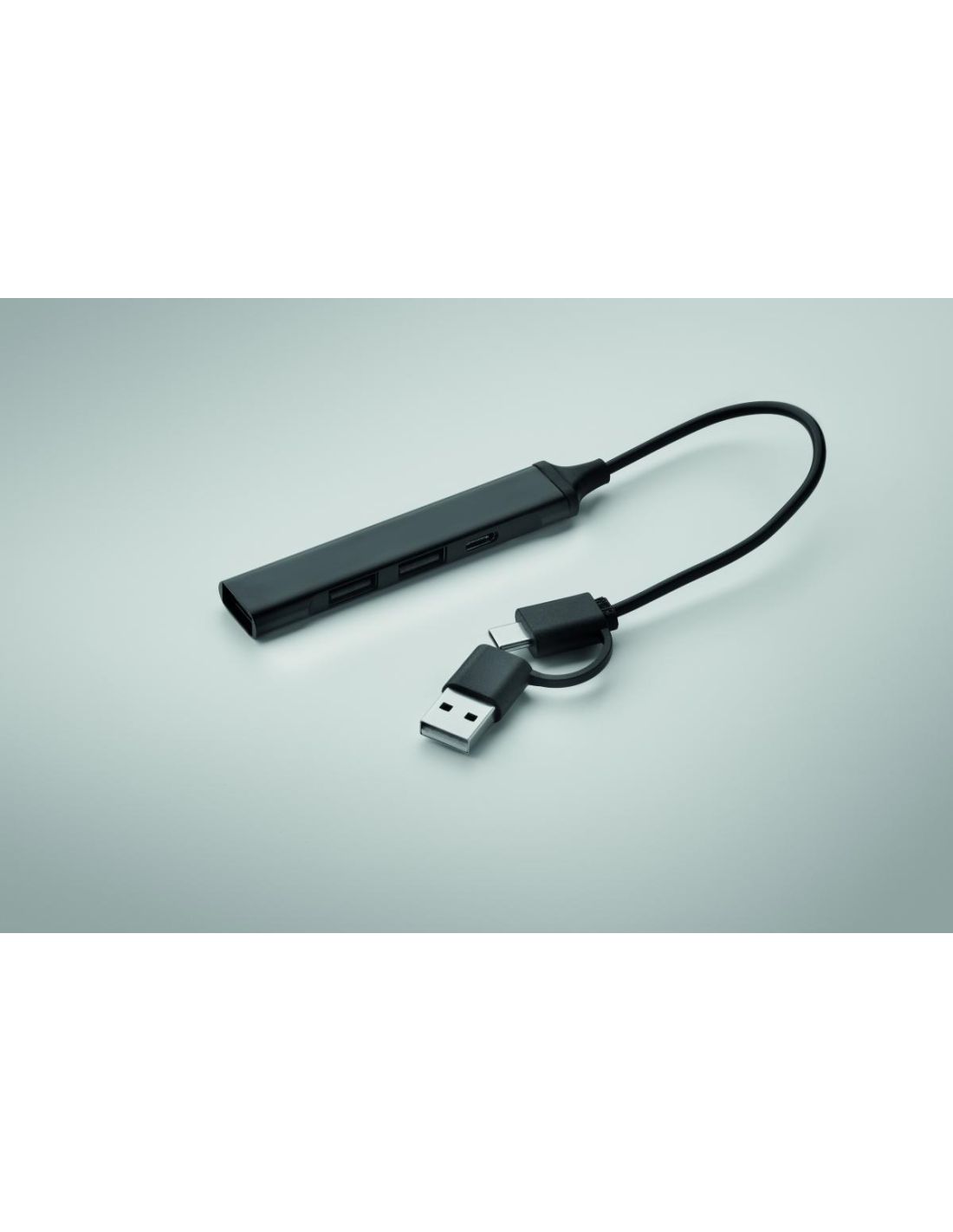 Hub USB de 4 puertos en aluminio reciclado. 3 USB-A + 1 Tipo-C. Entrada: 2 en 1 Tipo-C y Tipo-A. Longitud del cable: 19 cm.