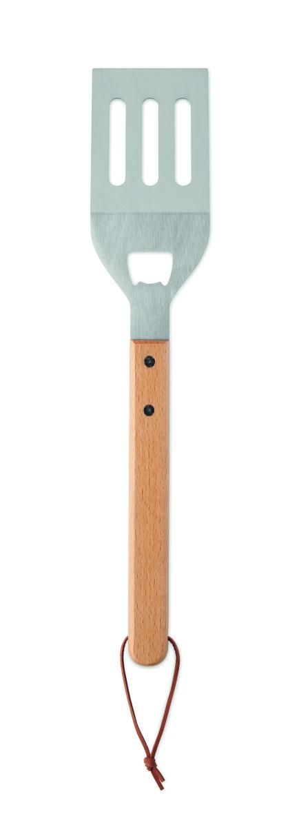 Espátula para barbacoa de acero inoxidable con mango de madera de haya y abrebotellas integrado. Incluye colgador de cuerda de PU para guardarla fácilmente.