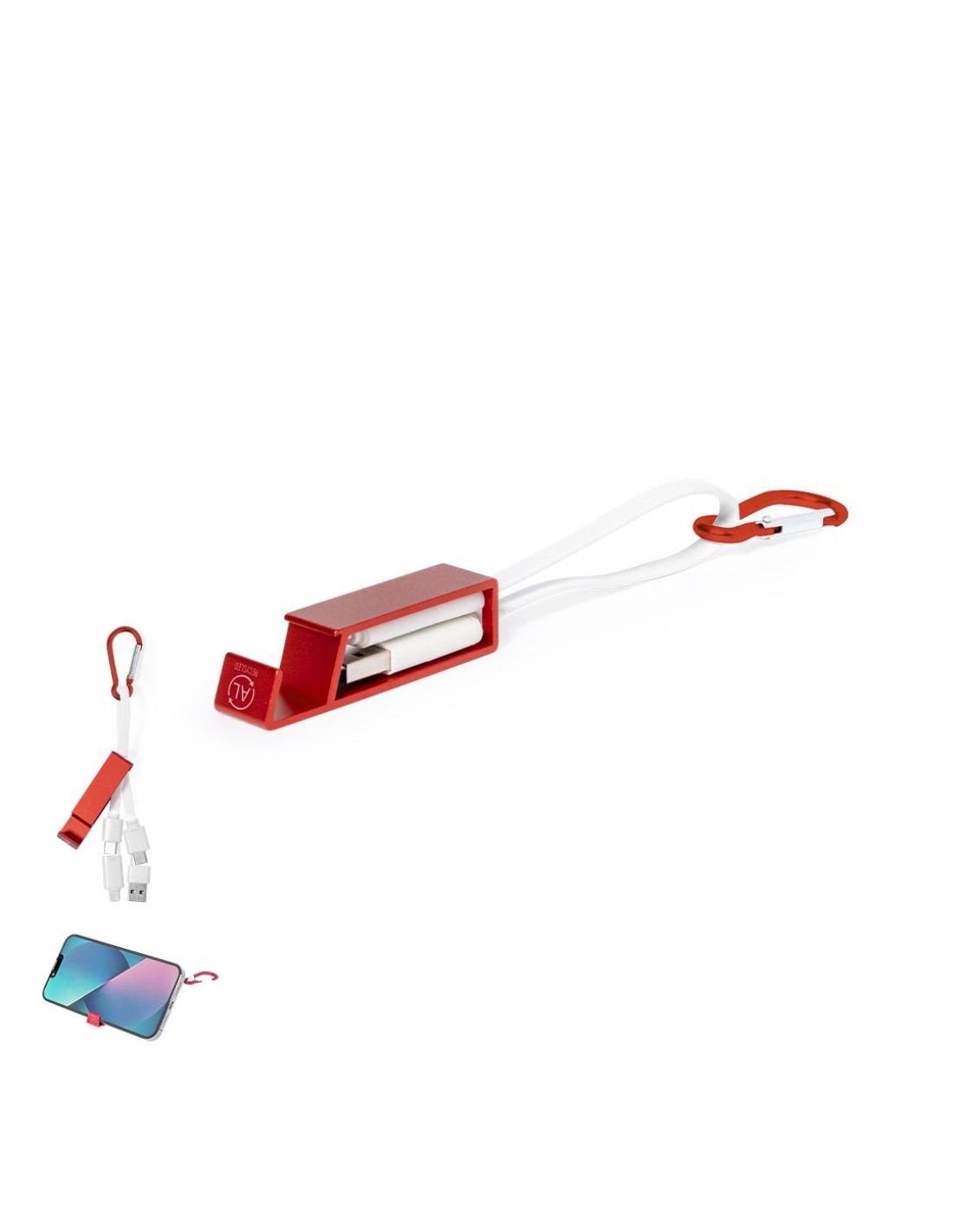 Cable cargador multifunción, fabricado en Aluminio Reciclado y con un ingenioso diseño que permite guardar los cables de carga cómodamente, además de facilitar el transporte. Incluye mosquetón a juego y soporte para smartphone, con conexión Tipo C (entrada y salida) y dual Micro USB / Lightning. En varios colores de acabado metalizado y con logotipo Aluminio Reciclado. Presentado en bolsa reciclada individual.El Aluminio Reciclado es un material con posibilidades de reciclaje casi infinitas, sin perder sus propiedades originales y consumiendo menos energía en este proceso.Certificación GRS (Global Recycled Standard / Estándar de Reciclaje Global), que garantiza el origen reciclado del material usado para fabricar el producto.
