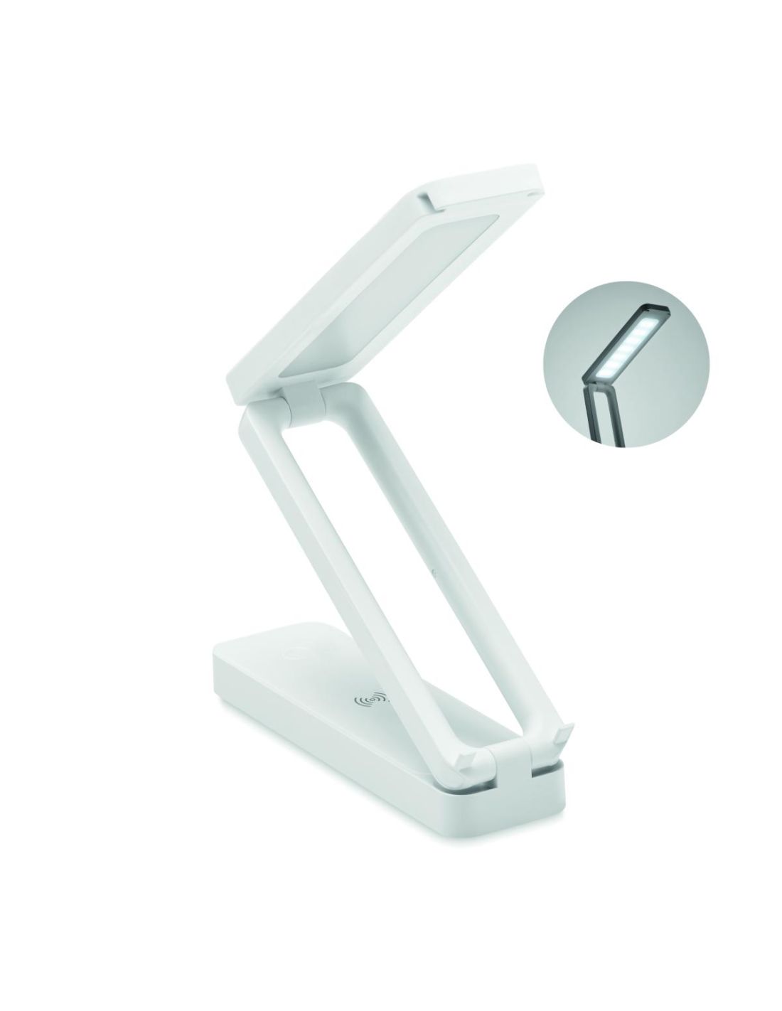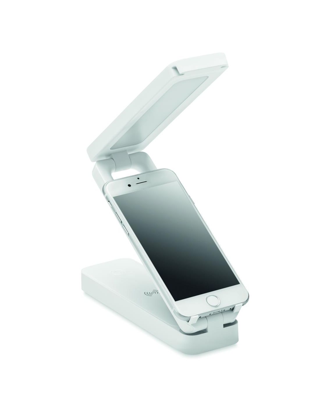 Lámpara plegable de ABS con 14 luces LED. 3 ajustes de brillo. Función cargador inalámbrico 10W. Salida: DC 9V/1.1A (10W) de carga rápida. Compatible con últimos Android, iPhone® 8 y más recientes.