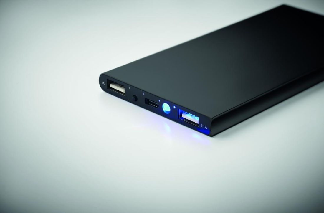 Powerbank. 8000 mAh. Aluminio reciclado y RABS (GRS). Salidas: USB-C y USB-A hasta 10W. Entrada: USB-C 10W. Cable USB-C a USB-C (2A) con adaptador …