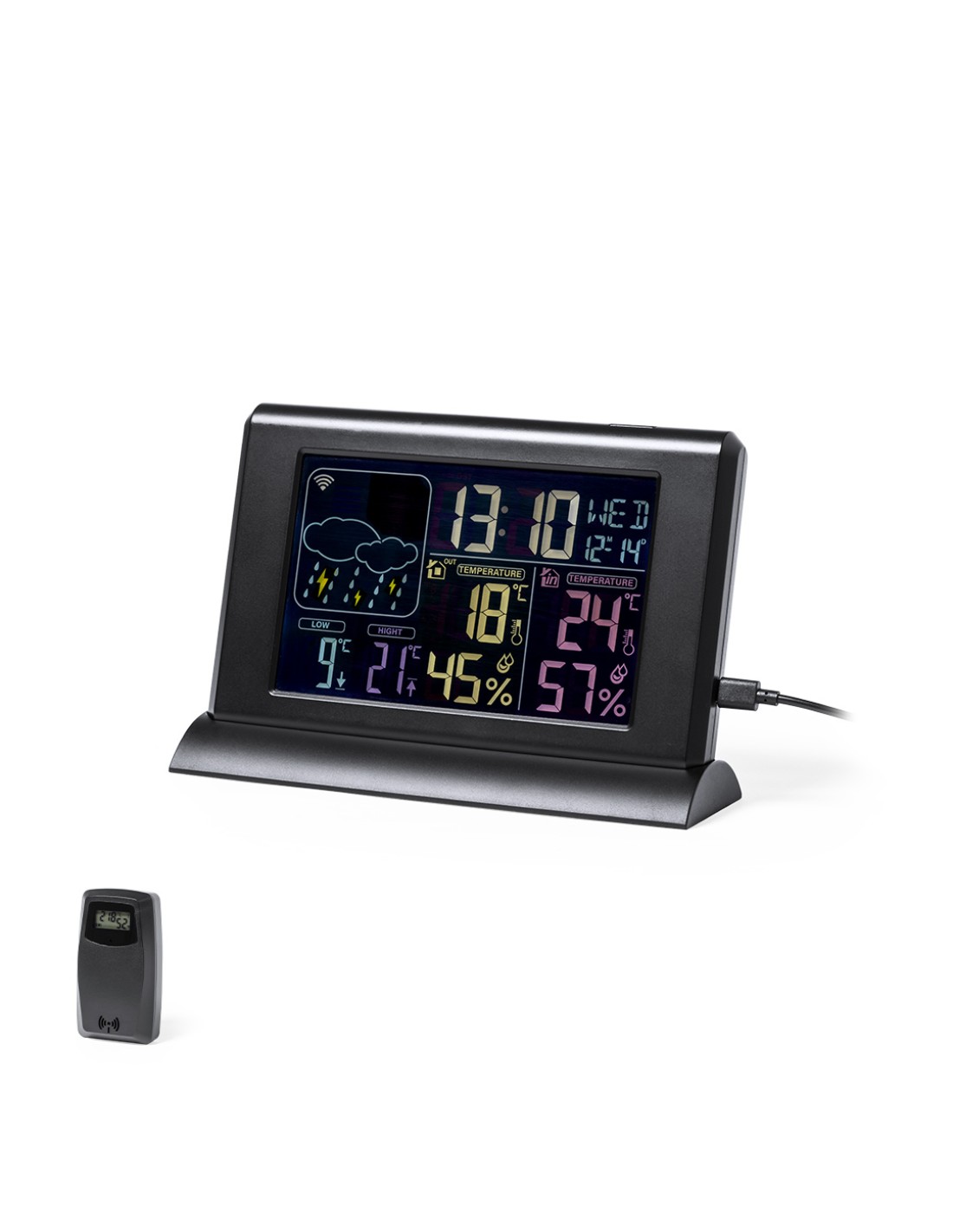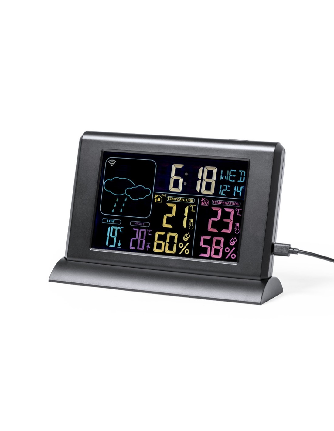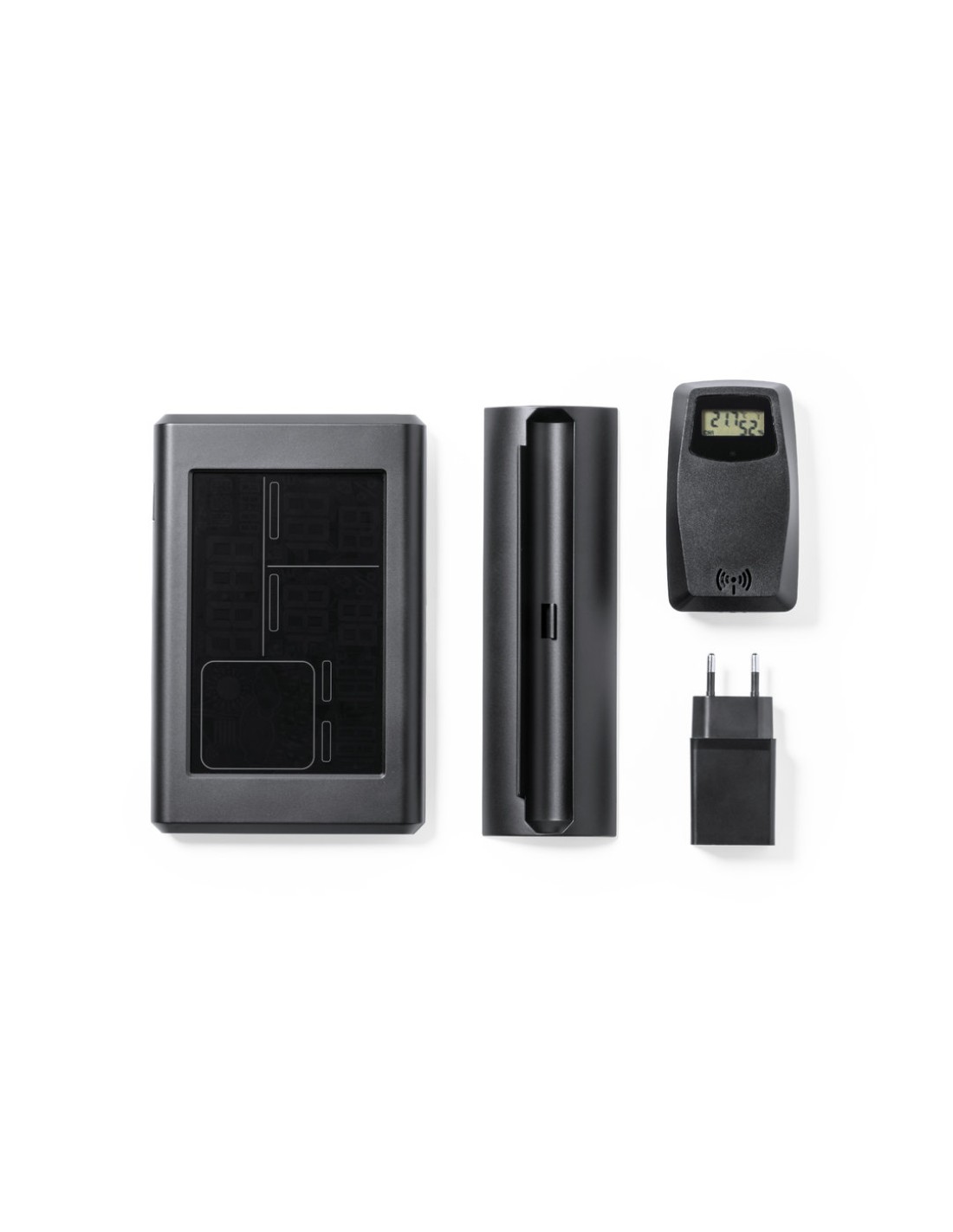 Estación meteorológica premium multifunción, fabricada en resistente ABS de acabado negro satinado. Incluye pantalla retroiluminada, de fácil lectura y con gráficos en color. Con sensor inalámbrico para temperatura/humedad exterior y sensor integrado para temperatura/humedad interior. Funciones alarma y calendario, con APP disponible -compatible con iOS/ Android- para control remoto a través de red WiFi y funciones extra. Adaptador de corriente y cable USB incluido de 1 m de largo, con soporte para montaje en la pared. Sensor externo con alimentación a pilas (2xAAA no incluidas). Presentación en caja individual de diseño kraft, con manual de instrucciones en español e inglés.