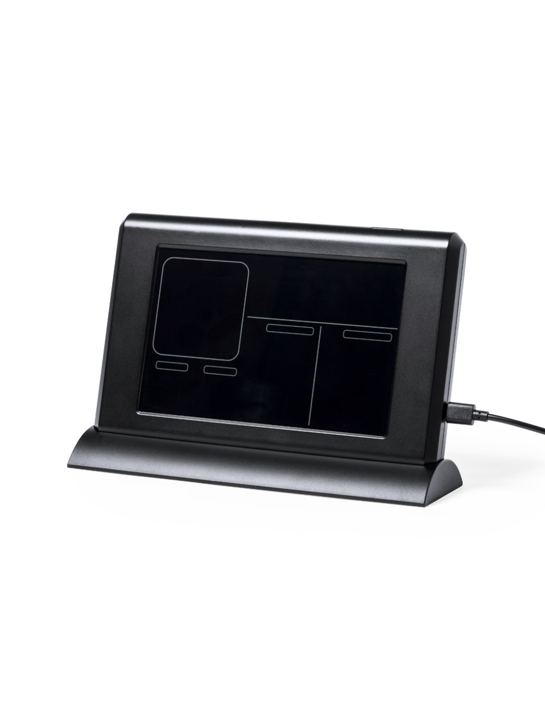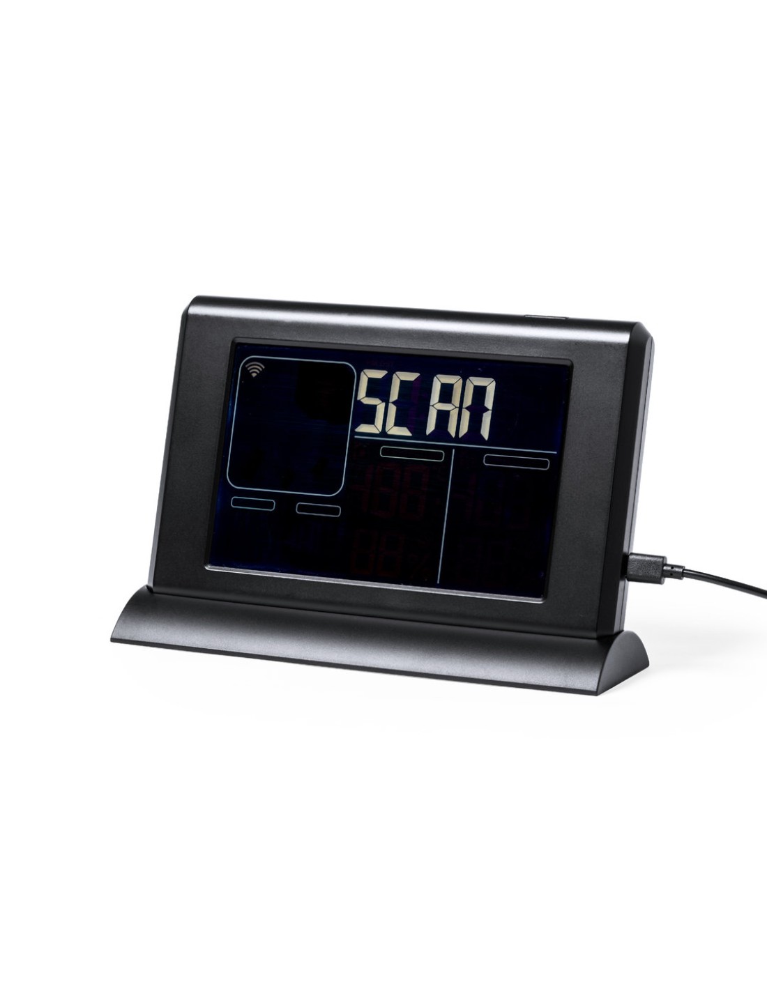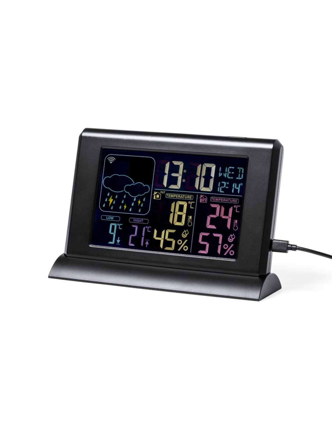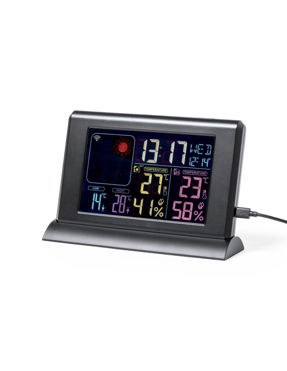 Estación meteorológica premium multifunción, fabricada en resistente ABS de acabado negro satinado. Incluye pantalla retroiluminada, de fácil lectura y con gráficos en color. Con sensor inalámbrico para temperatura/humedad exterior y sensor integrado para temperatura/humedad interior. Funciones alarma y calendario, con APP disponible -compatible con iOS/ Android- para control remoto a través de red WiFi y funciones extra. Adaptador de corriente y cable USB incluido de 1 m de largo, con soporte para montaje en la pared. Sensor externo con alimentación a pilas (2xAAA no incluidas). Presentación en caja individual de diseño kraft, con manual de instrucciones en español e inglés.
