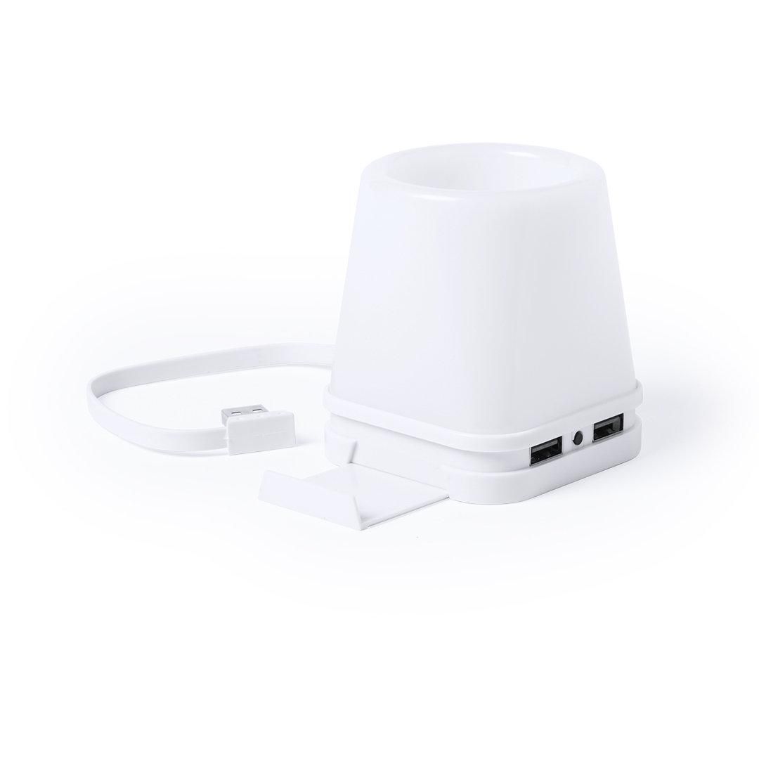 Original lapicero con puerto USB integrado. Retroiluminado por luz led, con 2 posiciones de iluminación y cuerpo en elegante color blanco para fácil marcaje. Incluye 4 puertos USB 2.0. Presentado en caja individual.