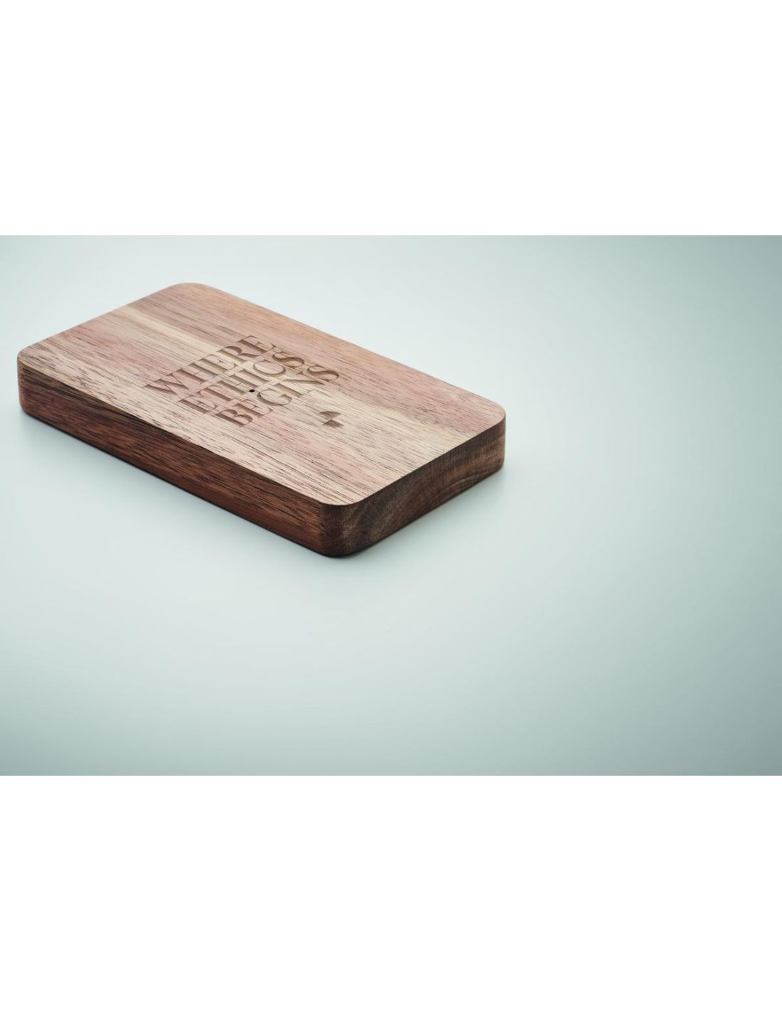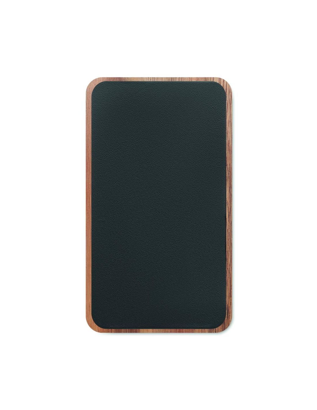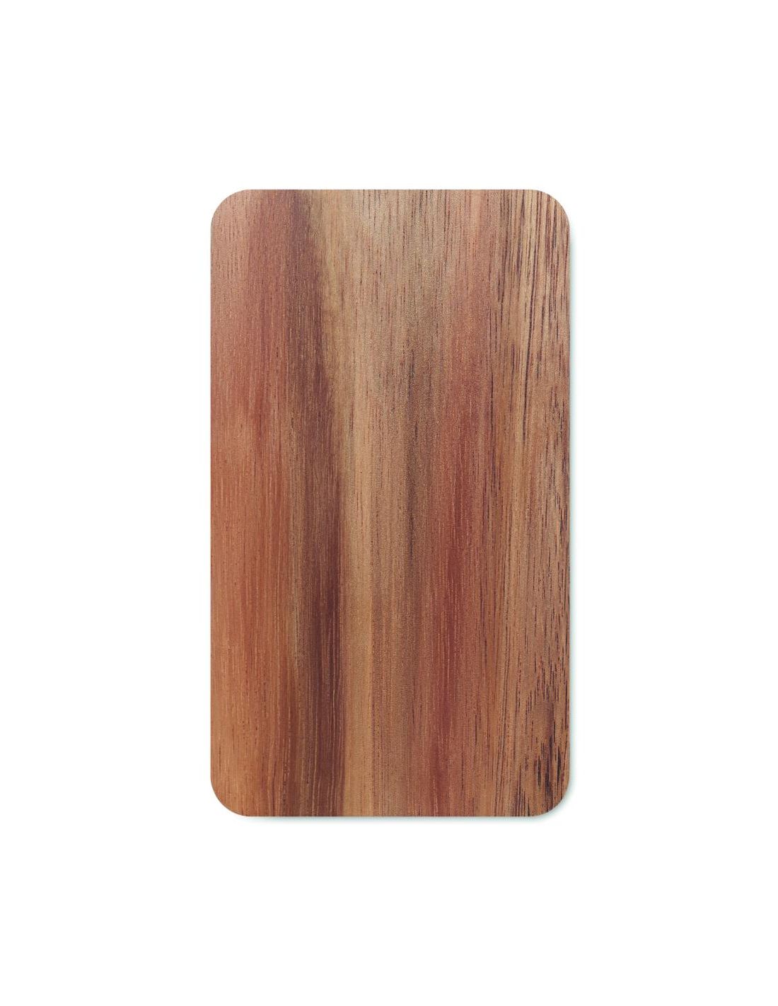 Cargador inalámbrico de 15W y power bank de 4000mAh con carcasa de madera de acacia y PU reciclado, que es un 58% reciclado (40% poliéster reciclado y 18% PU reciclado). Soporta tecnología de carga rápida (20W). Entrada/Salida: Tipo-C.