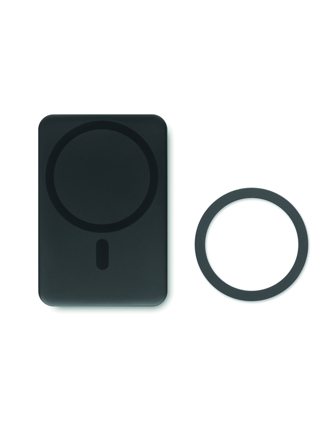 Cargador inalámbrico magnético (15W) y power bank (5000 mAh). Salida: DC 9V/1.1A (10W) ideal para carga rápida. Incluye un anillo metálico magnético adicional.