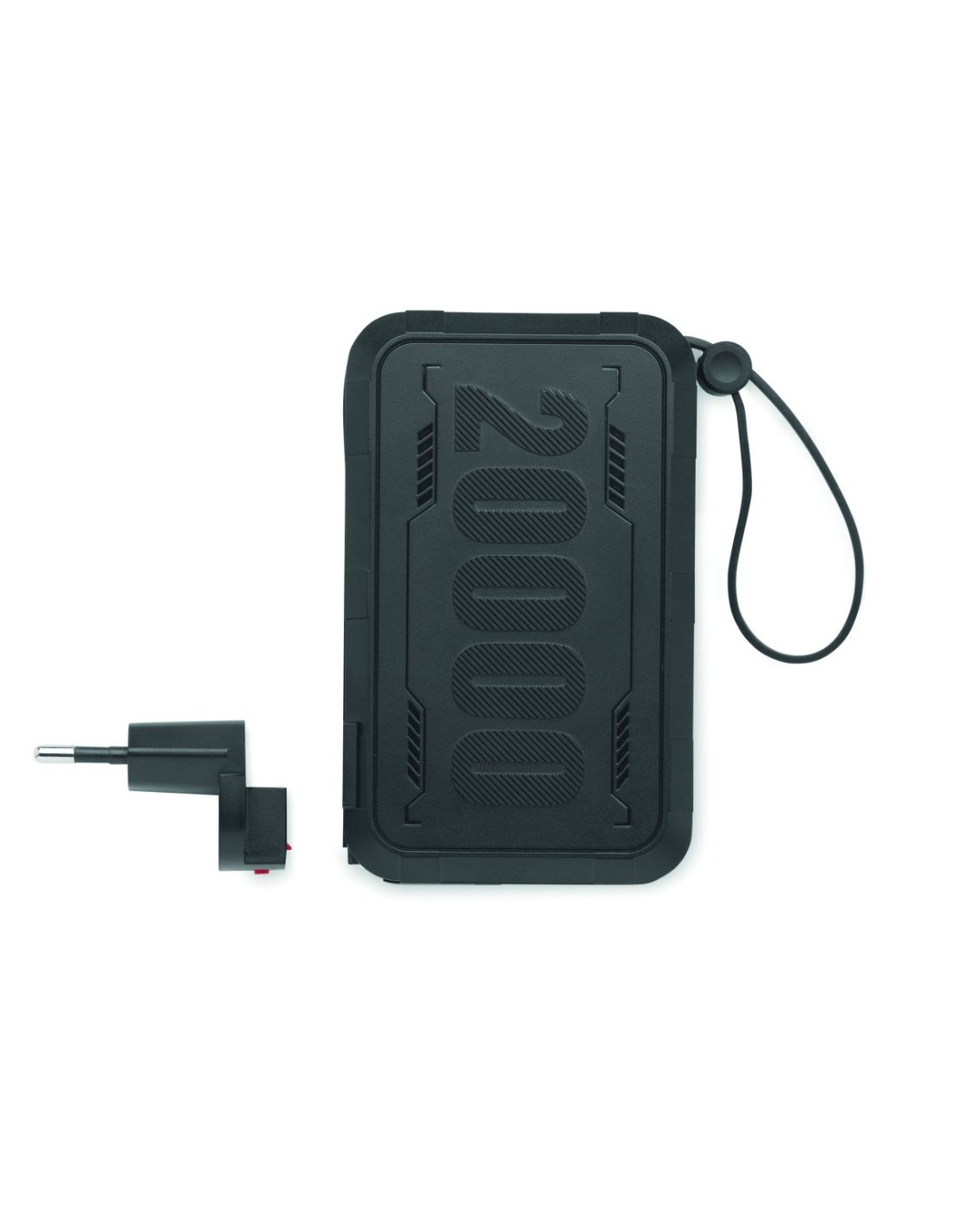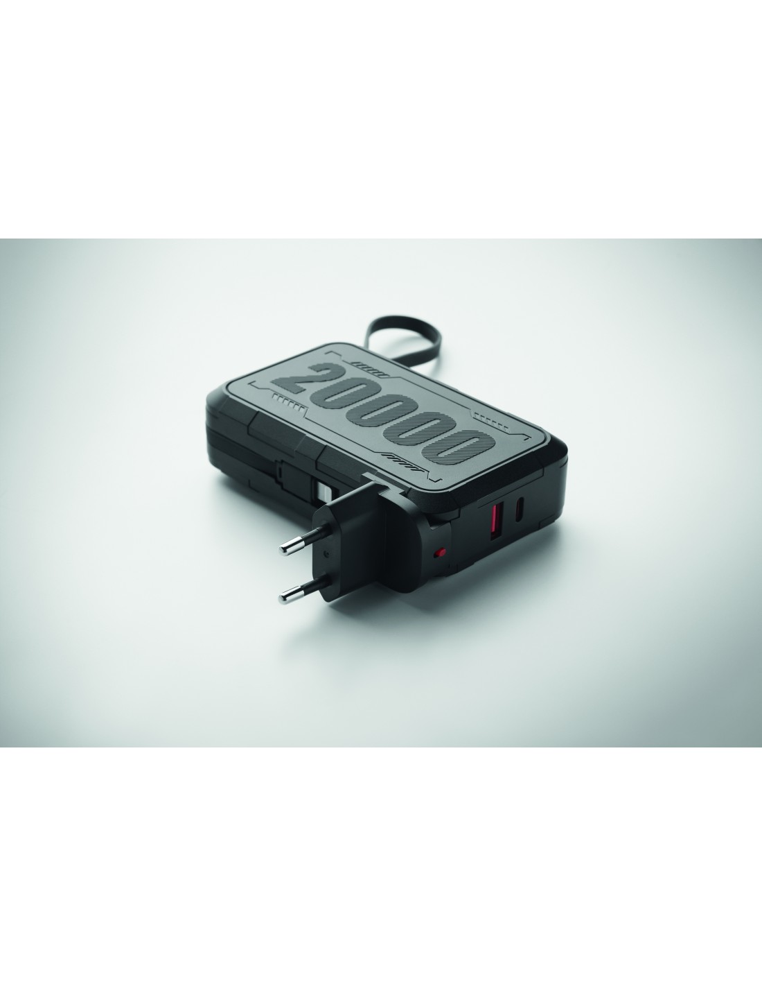 Power bank de 20.000 mAh en ABS con enchufe US integrado y enchufe de AC extraíble. Entrada/salida USB A y tipo-C. Cables integrados de tipo C y cl…