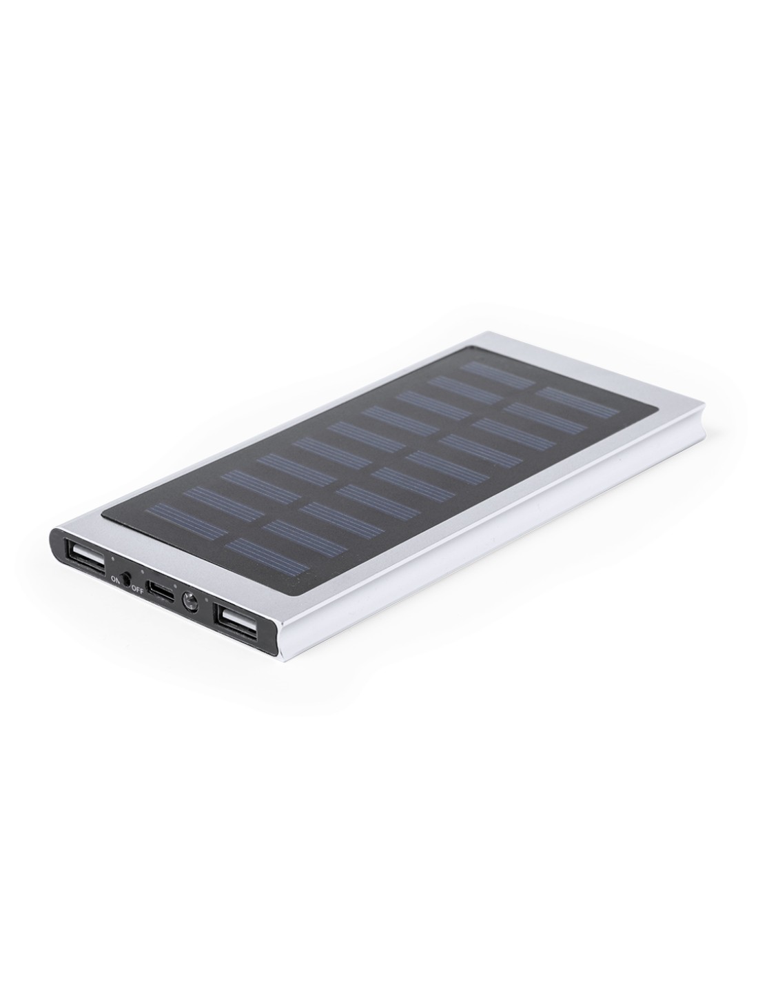 Batería auxiliar externa de recarga solar y de gran capacidad de carga -8.000 mAh-. Fabricada en aluminio, con conector de entrada/salida Tipo C y 2 salidas USB. Presentada en caja individual de diseño kraft. Disponible manual de instrucciones en español e inglés.Las capacidades mostradas en todas nuestras baterías auxiliares externas son reales, incorporando todas ellas baterías de grado A y no recicladas, con una vida útil de al menos 500 ciclos de carga y según normativa CE. Además, están fabricadas conforme a los estándares RoHS y en cumplimiento con los siguientes requisitos de seguridad:Sistema de protección contra sobrecarga del power bank.Sistema de protección contra descarga completa que proporciona una mayor durabilidad del power bank.Sistema de bloqueo para evitar cortocircuitos.Sistema de transferencia de carga constante, acorde con la capacidad del dispositivo de destino.