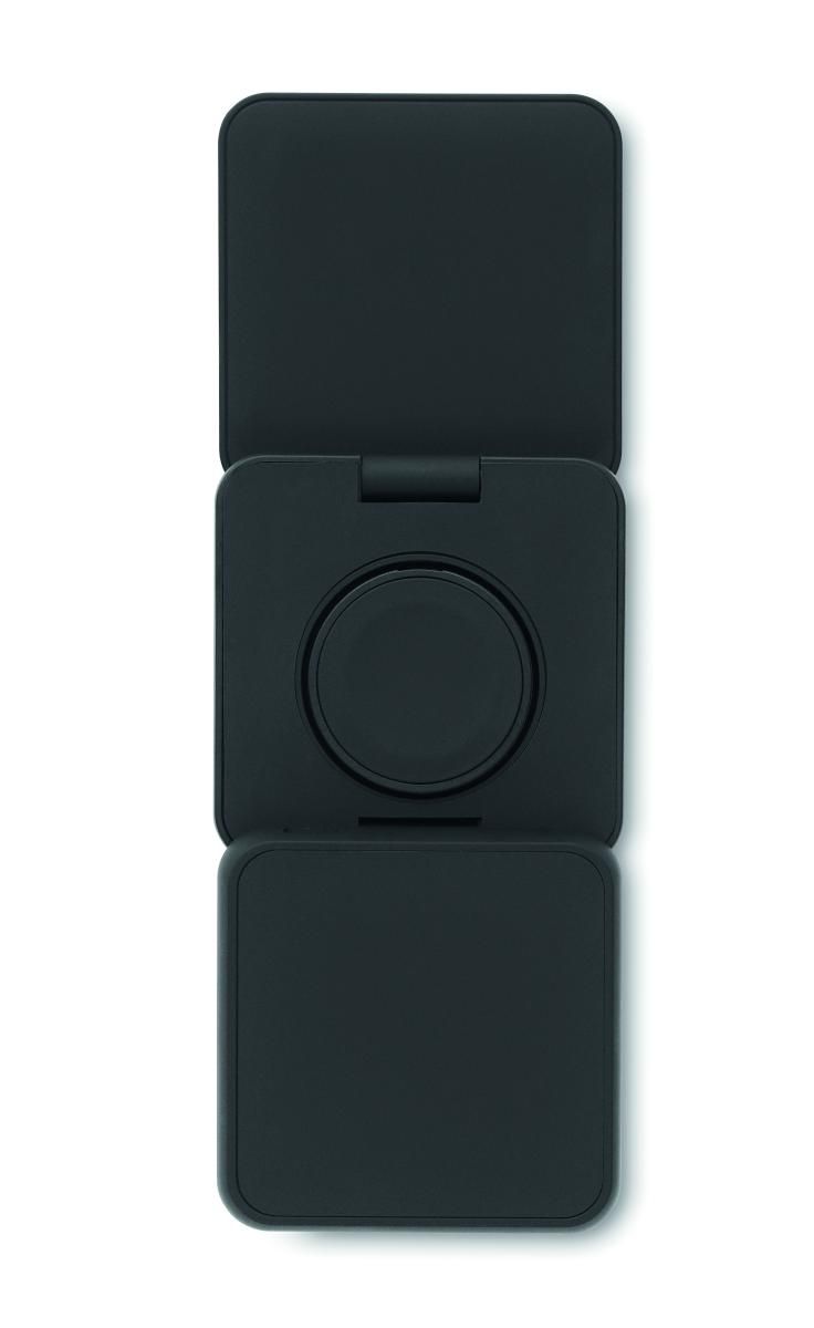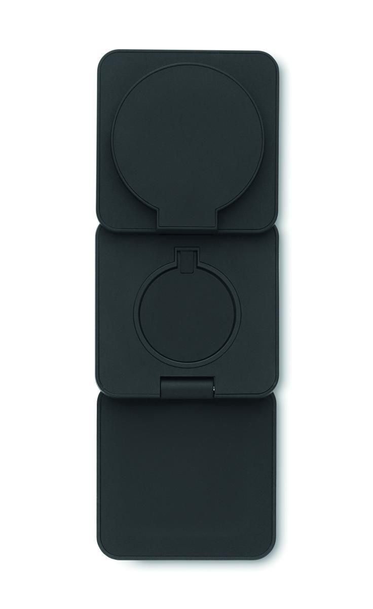 Base de carga plegable 3 en 1 en ABS reciclado engomado. Incluye un cargador inalámbrico magnético de 15 W, un cargador para smartwatch (solo Apple®) y un cargador TWS.