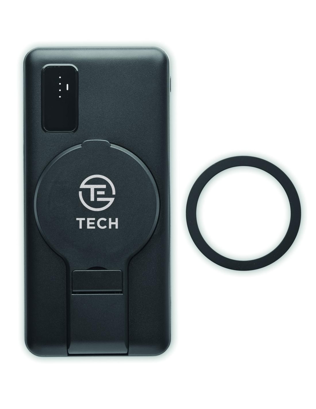 Cargador inalámbrico magnético (15 W) y power bank (10000 mAh) en ABS y soporte magnético para el teléfono. Entrada: micro B, Tipo-C. Salida 2x USB-A Entrada/Salida: Tipo-C. Salida: DC 9V/1.66A (15W) ideal para carga rápida. Incluye anillo metálico m