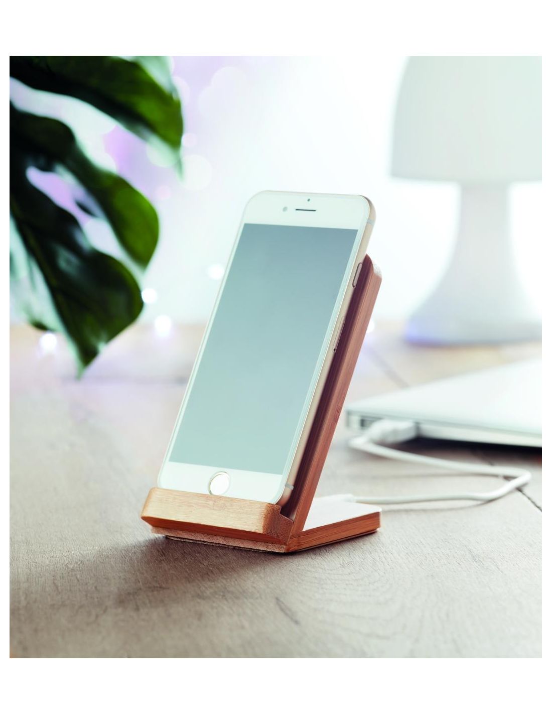 Cargador inalámbrico de doble bobina para 1 dispositivo en carcasa de bambú y con función de soporte. Coloque el smartphone sobre él para iniciar la carga. Salida: DC5V/1A (15W).