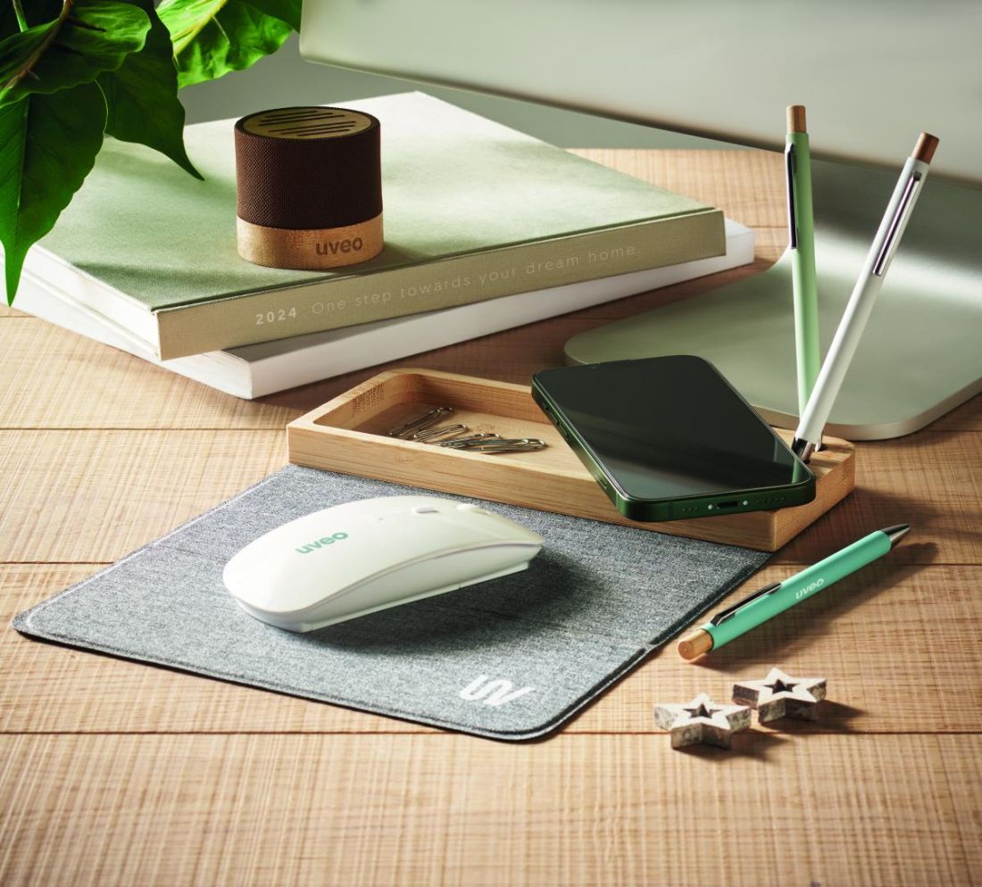 Cargador inalámbrico y organizador de escritorio en bambú con soporte para teléfono, 3 portabolígrafos y alfombrilla de ratón plegable RPET. Salida…