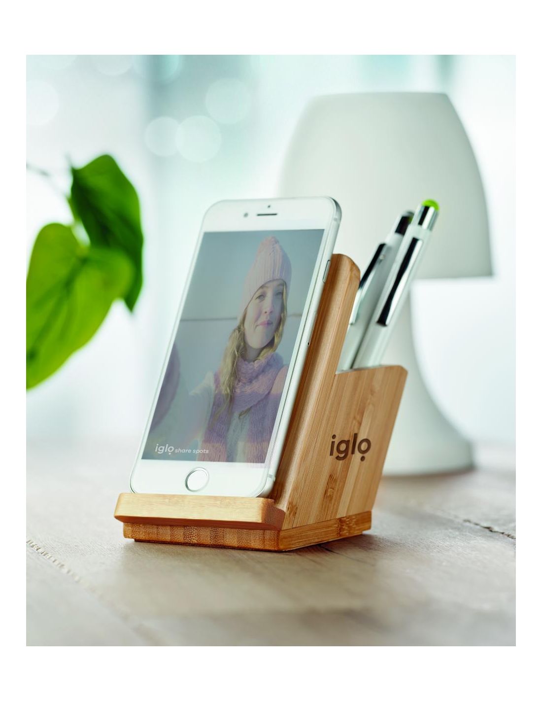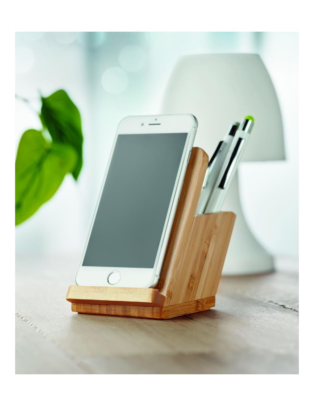 Cargador inalámbrico de doble bobina para 1 dispositivo con carcasa de bambú y con funcionalidad de soporte y portalápices. Salida: DC5V/1A (5W). El bambú es un producto natural, puede haber ligeras variaciones en el color y el tamaño por artículo, l