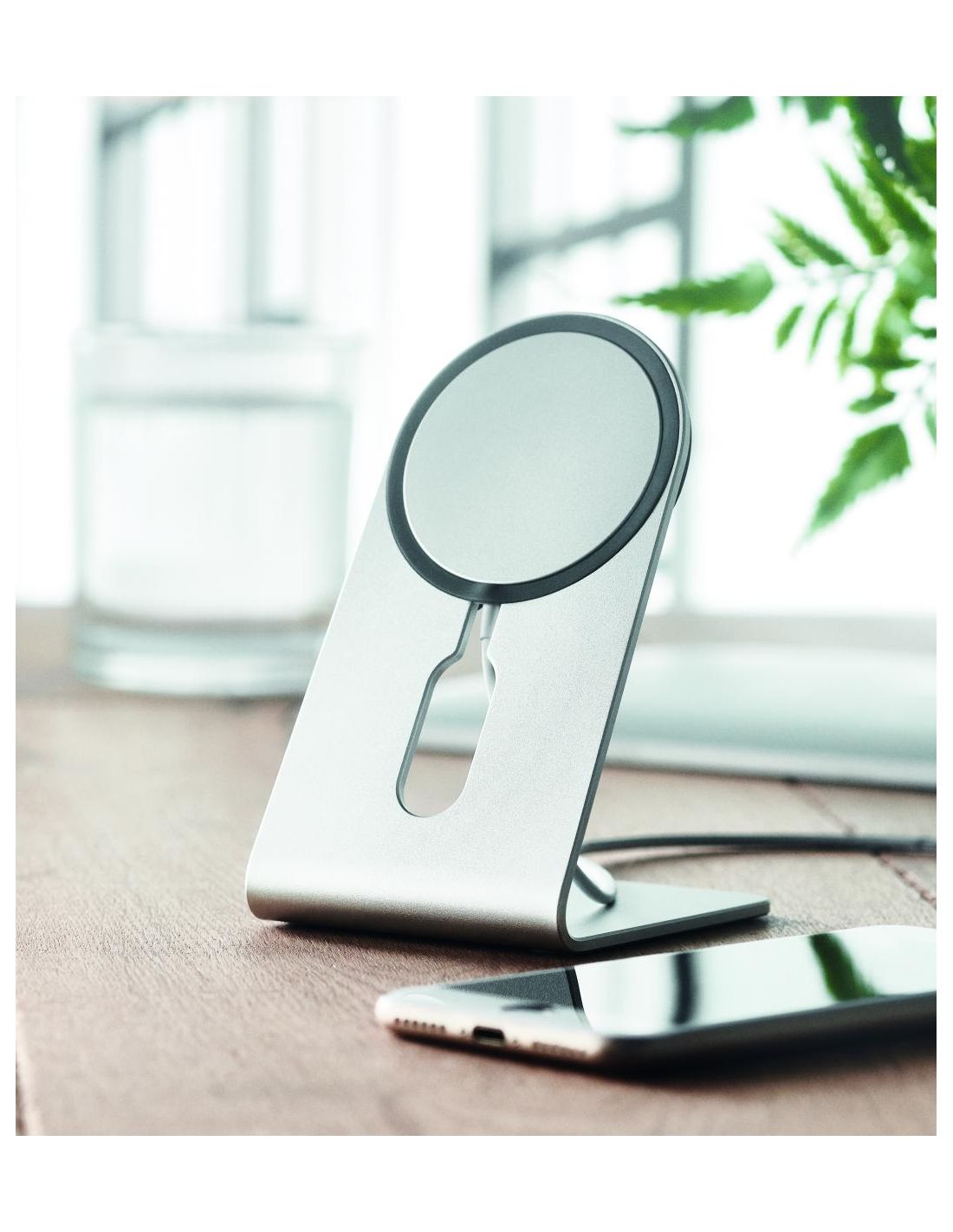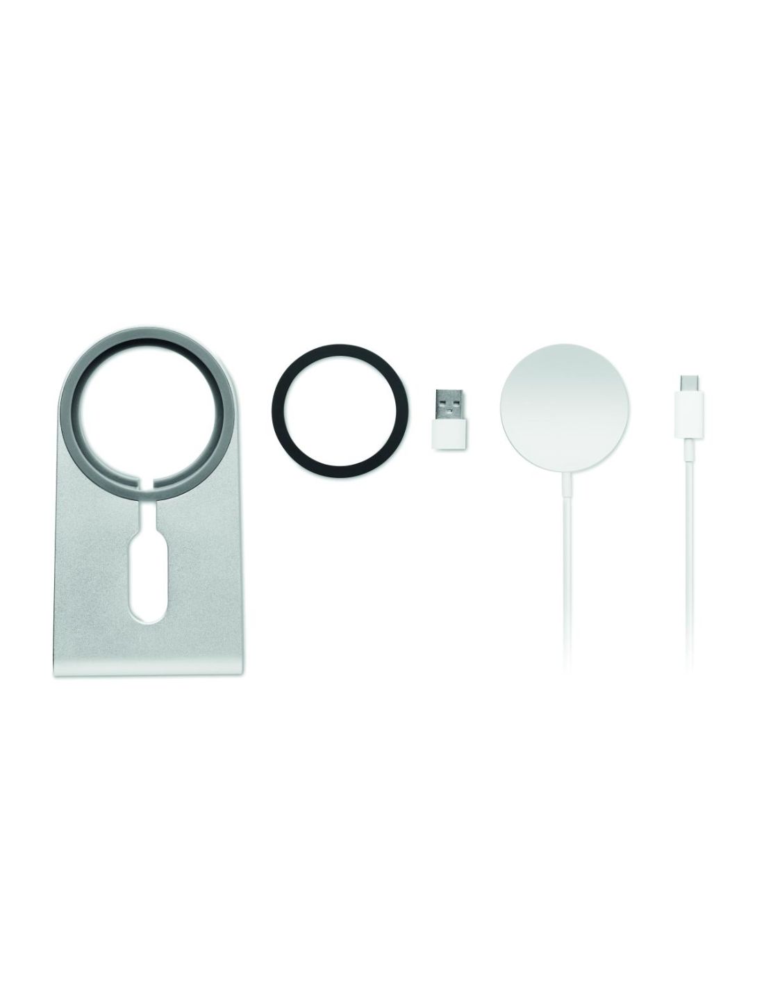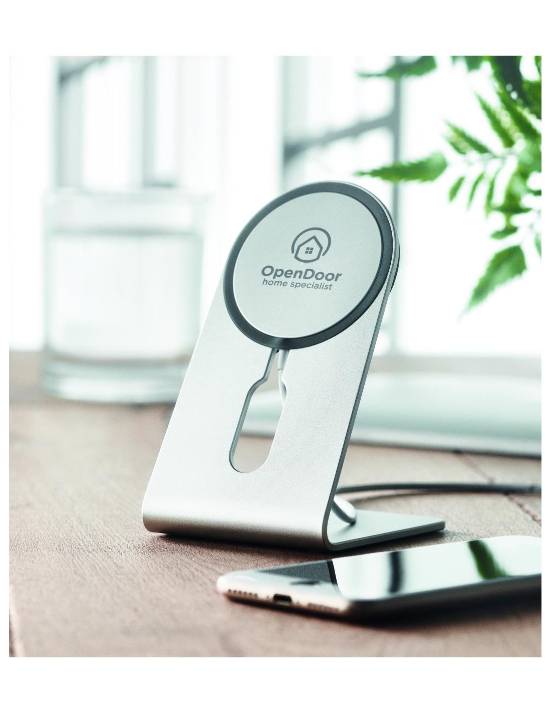 Cargador inalámbrico magnético de aluminio de 15W con soporte para teléfono. Incluye anillo metálico magnético adicional para la carga de otros teléfonos con carga inalámbrica no magnética. Salida: 9V/1.67A (15W) para una carga rápida.
