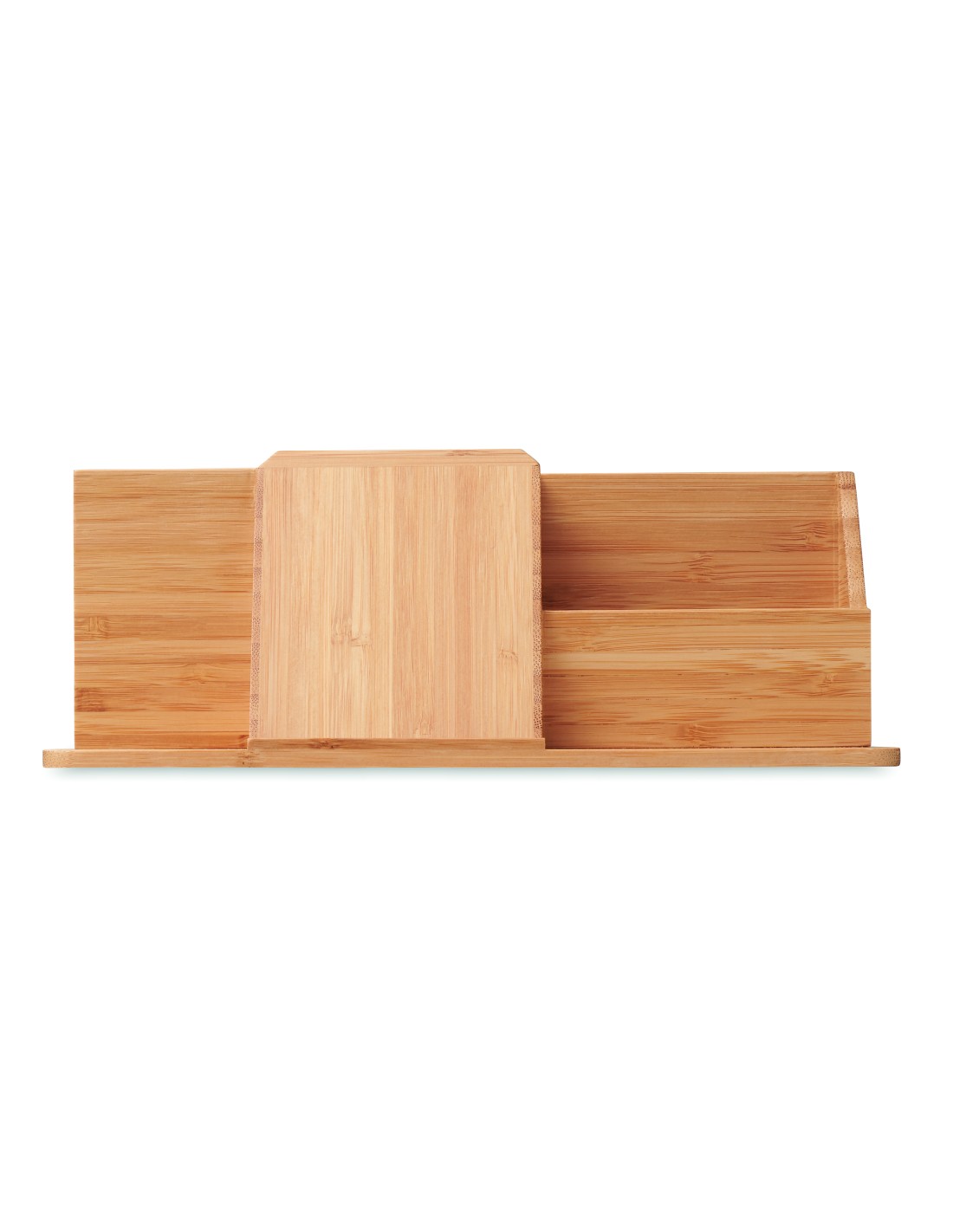 Organizador de sobremesa de bambú con soporte para bolígrafos y con soporte para teléfono de carga inalámbrica de 15W. Salida: DC 9V/1.1A (15W) para una carga rápida. El bambú es material natural, el color del articulo puede variar.