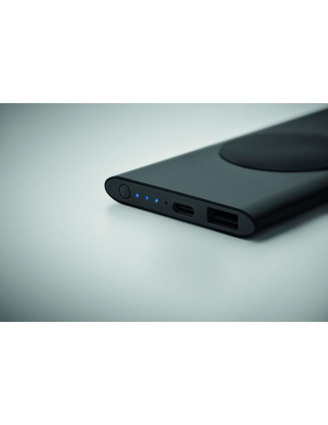 Power bank de 5000 mAh con carga inalámbrica de 15 W en aluminio reciclado. Entrada: Tipo-C. Salida: 1 x Tipo-C y 1 x Tipo-A.
